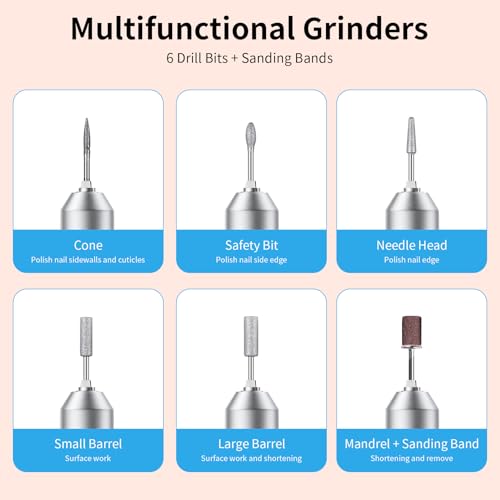 Electric Nail Drill Machine 45,000RPM - Professional Electric and Rechargeable Nail Drill with LCD Display, 6 Bits and 30 Sanding Bands, Low Heat Quiet E-File for Acrylic Gel Nails (Light Pink)
