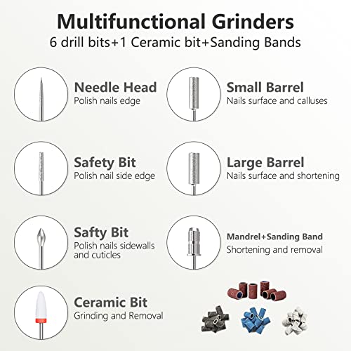 - Professional Electric Nail Drill Kit: This electric nail drill kit includes 6 metal bits and 1 ceramic bit designed for acrylic nails, gel nails, dip powder, thick nails, cuticles, and calluses?one set for comprehensive manicure and pedicure care.