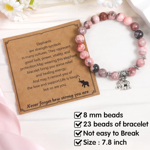 - Healing Bracelets with Charms: This bracelets is made of pink natural stone and elephant charms, These healing stone can promotes inner balance and stability. It is believed to ward off negative energies and bring good luck. Each stone is strung on high-quality elastic stretch cord to ensure good quality and is suitable for most women and girls