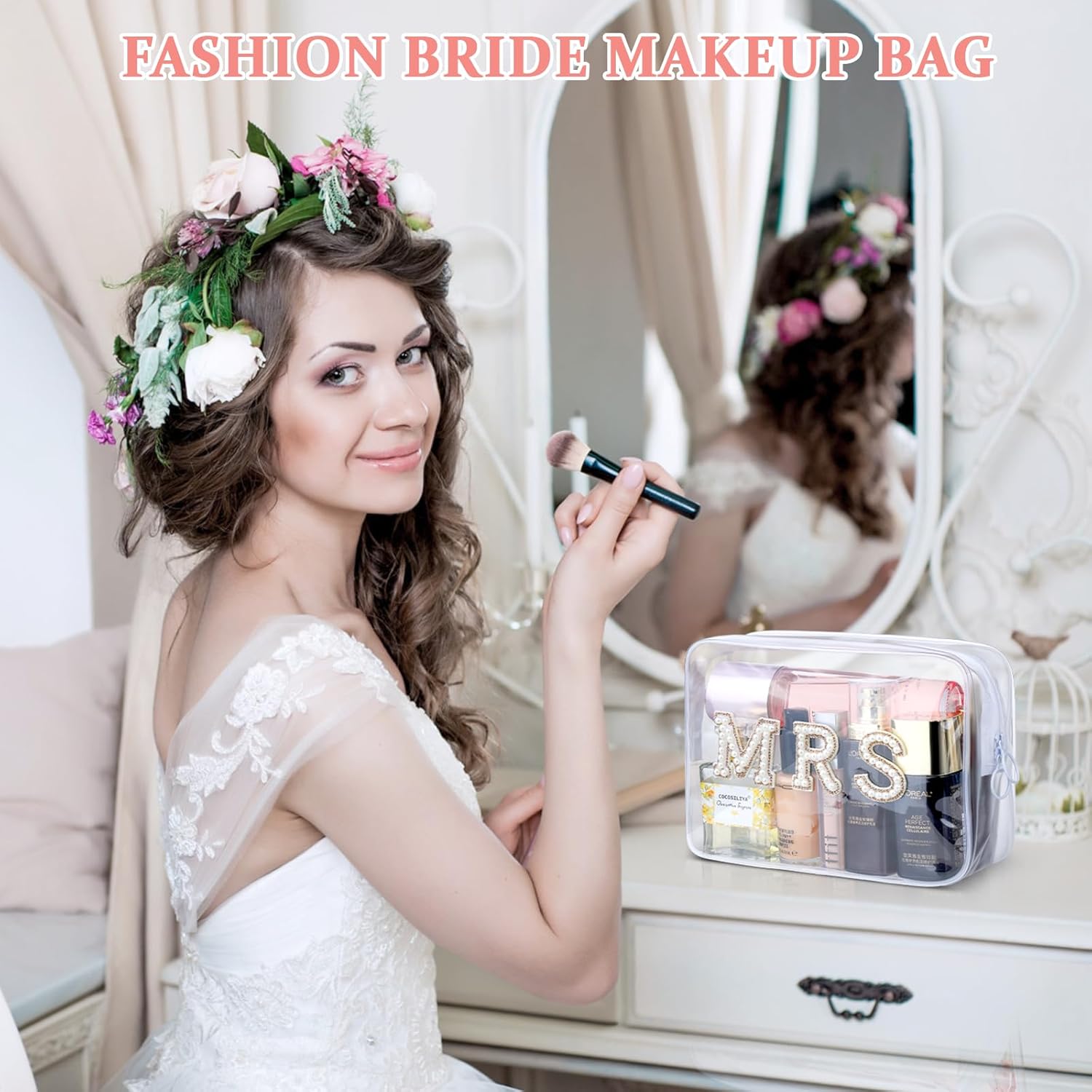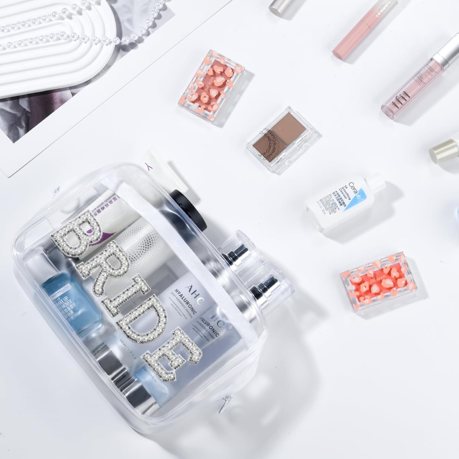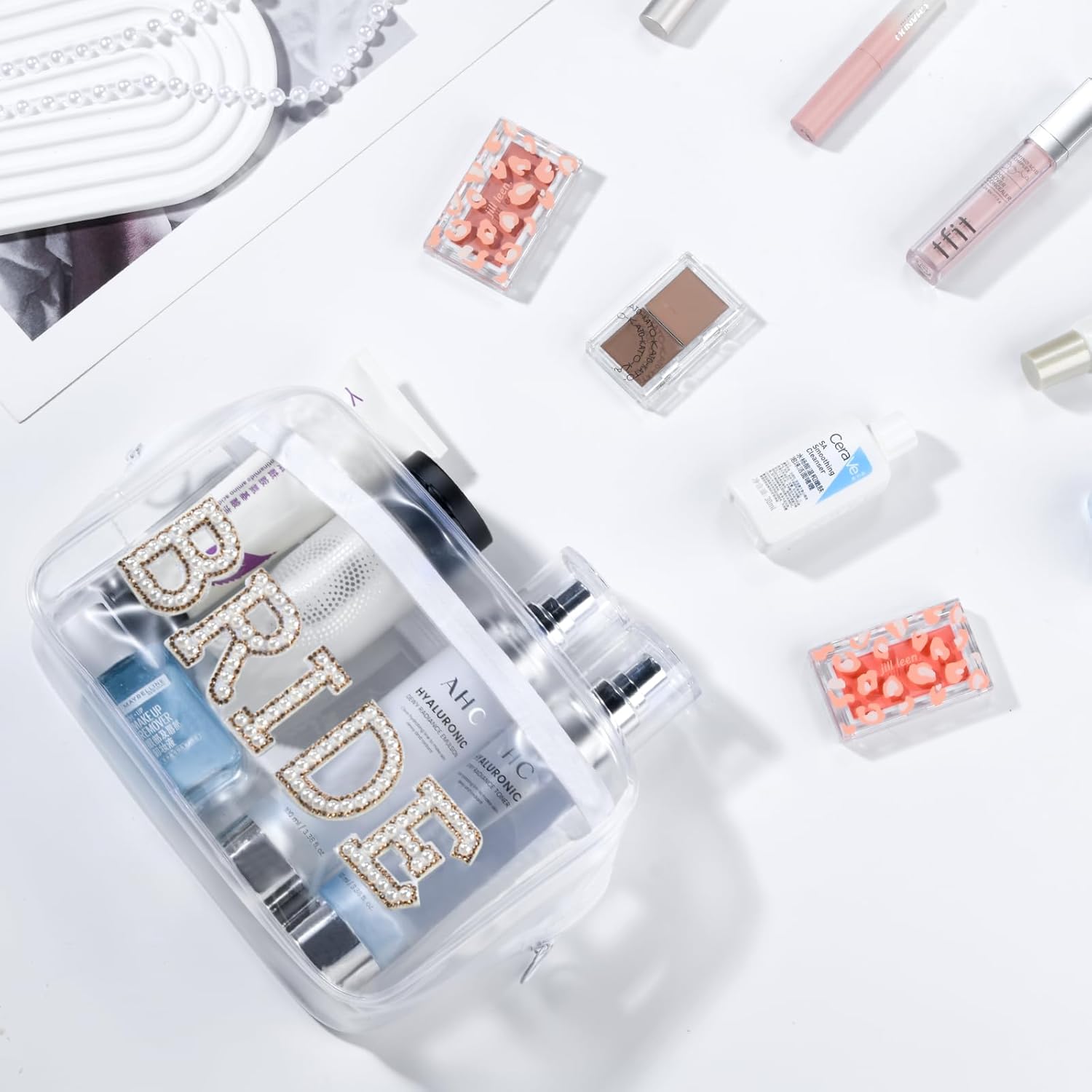 - Bride To Be Gifts: Clear patch makeup bag is made of bright pearls form the letters [BRIDE], with golden glitter around the letters, adds a touch of elegance and charm to your special day.With stylish and novel appearance, let our exquisite large clear cosmetic bag enhance your bridal ensemble.No girl would refuse such a beautiful shiny bag