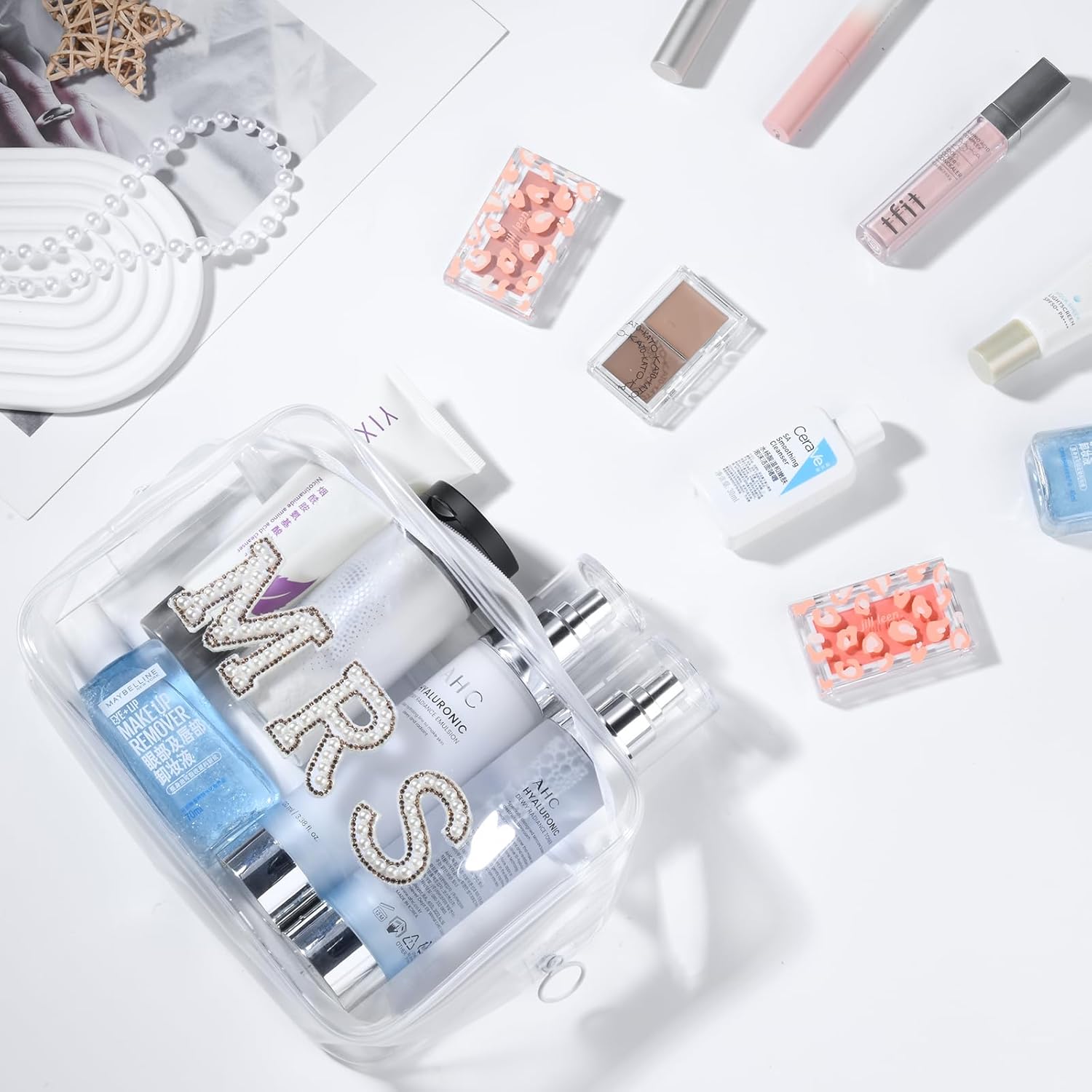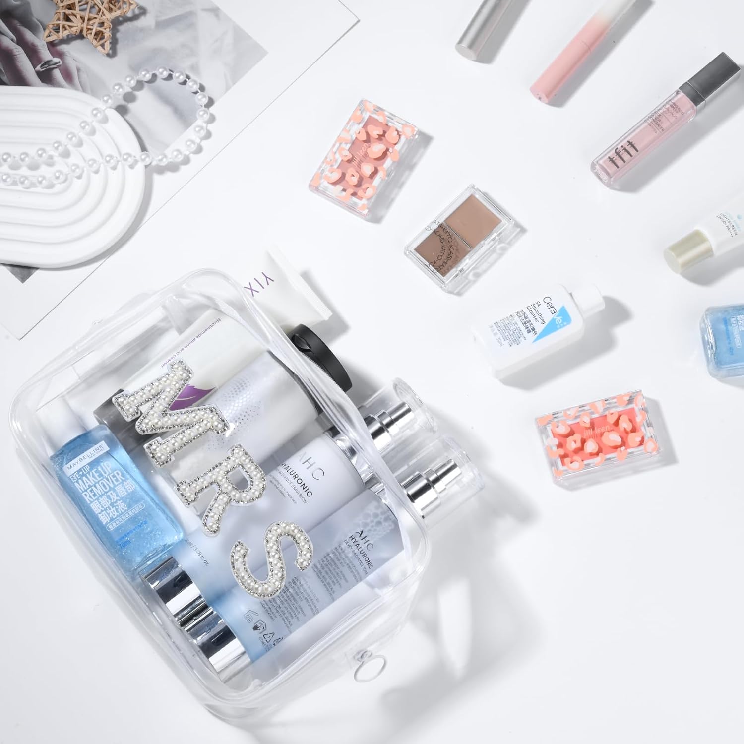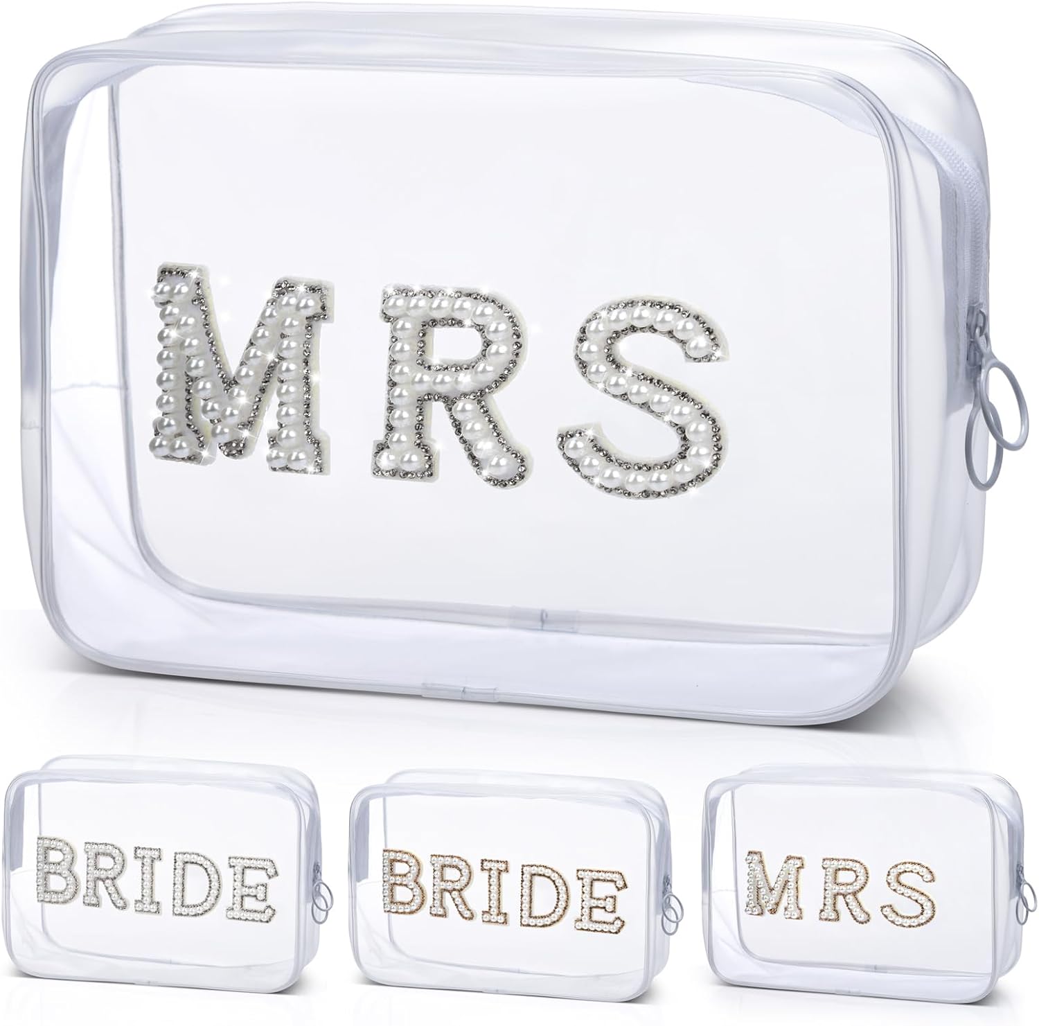 - Bride To Be Gifts: Clear patch makeup bag is made of bright pearls form the letters [BRIDE], with golden glitter around the letters, adds a touch of elegance and charm to your special day.With stylish and novel appearance, let our exquisite large clear cosmetic bag enhance your bridal ensemble.No girl would refuse such a beautiful shiny bag