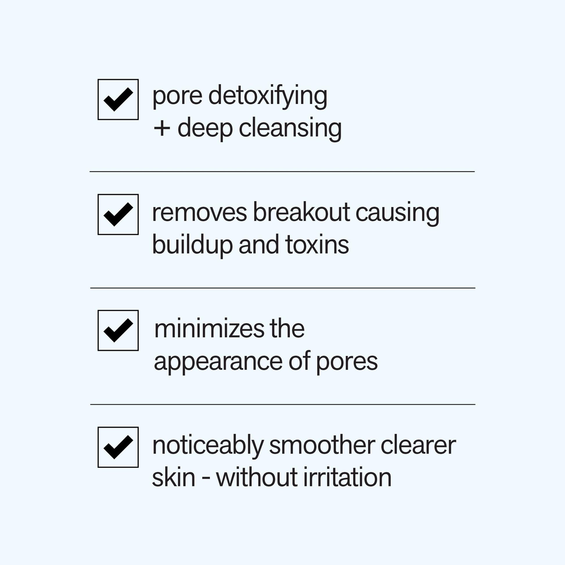 - "This formula removes breakout causing buildup and toxins, while minimizing the appearance of pores for noticeably smoother, clearer skin - without irritation."