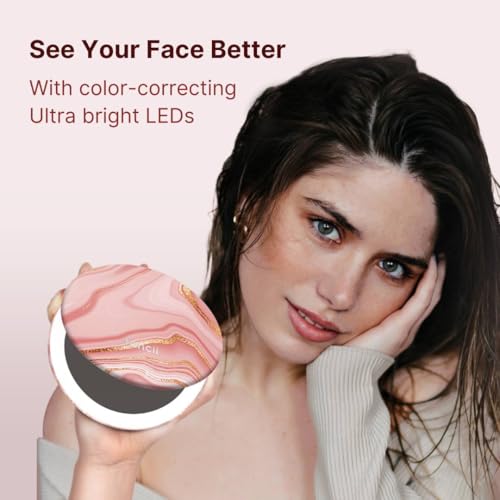 Fancii Taylor LED Lighted Travel Makeup Mirror, Rechargeable, 10x /1x Magnifying, Tru-Glow Lighting System, XL Large 5¡± Wide | Compact Mirror for Purses (Marble Rose)