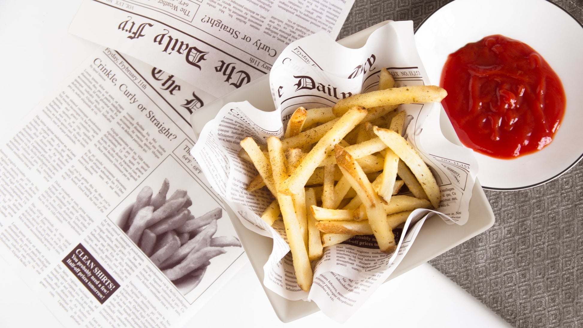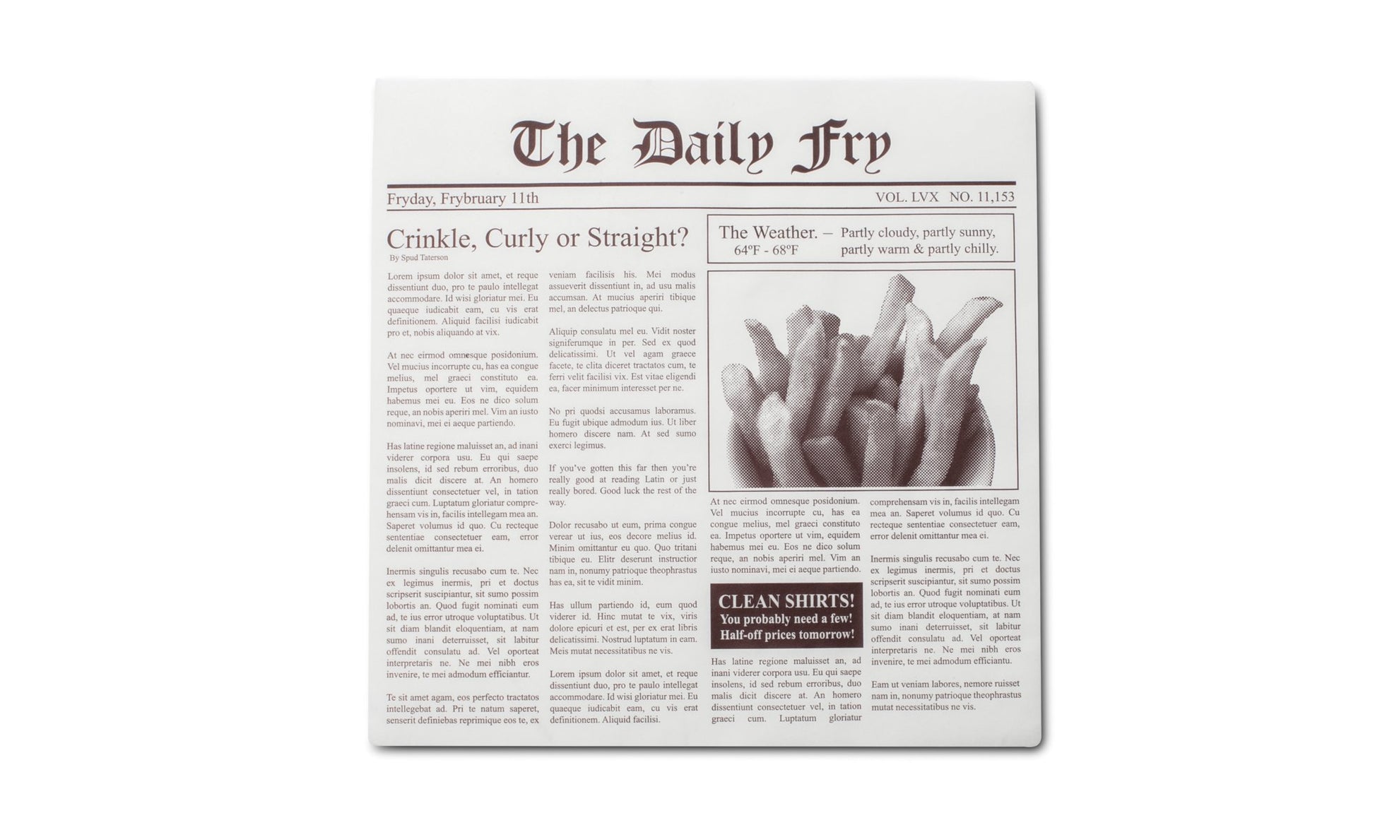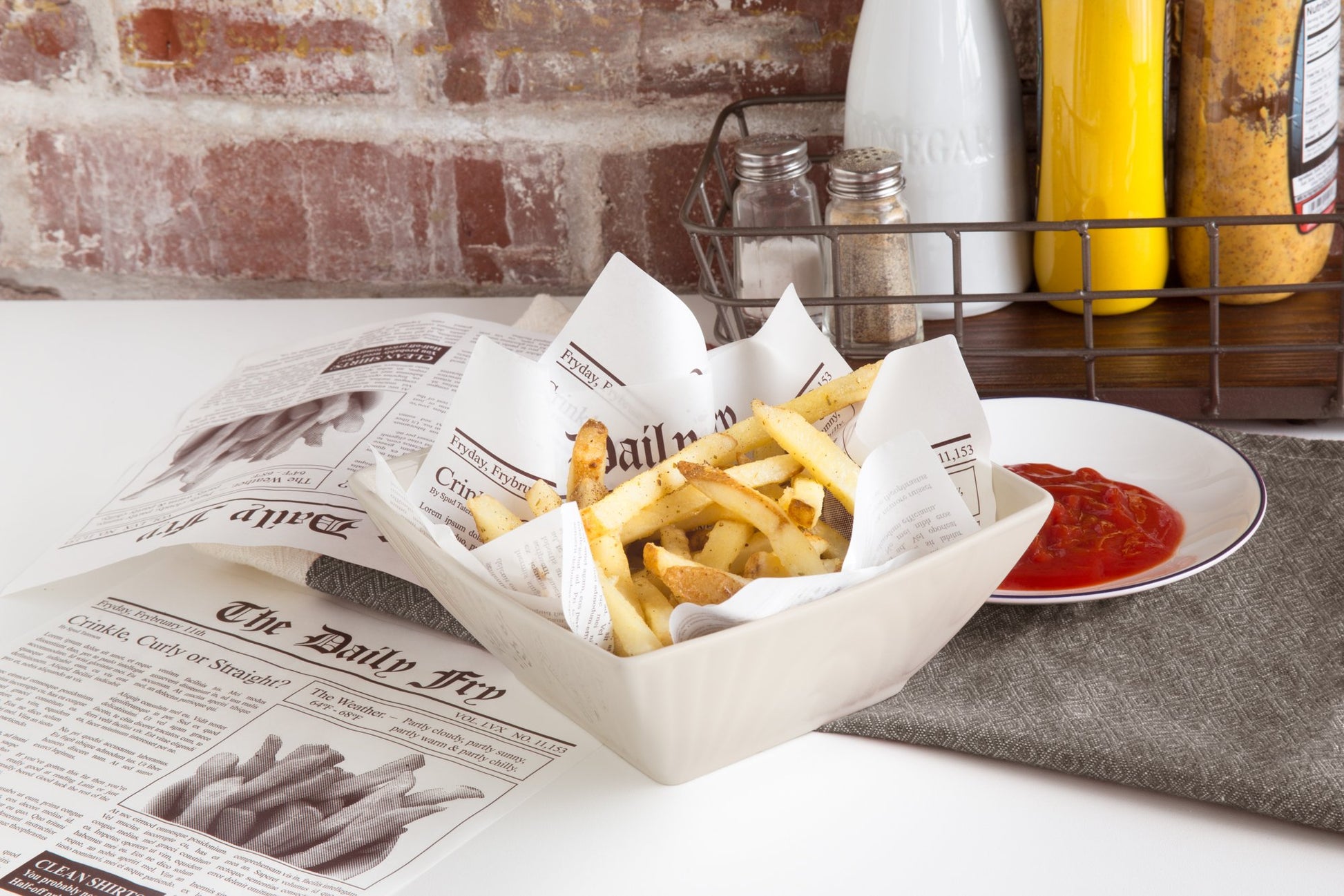 Details: Whether it's an evening dinner inside at the kitchen table, a breezy lunch-time picnic, or a barbecue on a hot summer day, serve your food in style! Designed to be placed in the bottom of a fry or sandwich basket, these wax paper liners will help soak up the grease from your favorite pub foods. Featuring a fun newsprint design, this pack of 24 disposable liners will make both serving your guests and cleaning up afterwards a breeze. Everyone will love reading the news of the "The Daily Fry" printed on the liners while enjoying their favorite snacks. Perfect for french fries, burgers, hot dogs, chicken fingers, sandwiches, potato chips, pretzels, and more! The liners can also be easily rolled and shaped for use in a french fry stand cone. Serve and entertain easier.