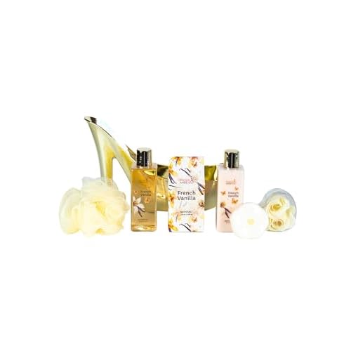 Freida & Joe Elegant 9-Piece Bath Set in High Heel Shoe ? Luxurious Spa Gift Basket for Women, Includes Shower Gel, Body Lotion, Bath Salts, Soap Flowers, Bath Fizzer & Sponge (French Vanilla)