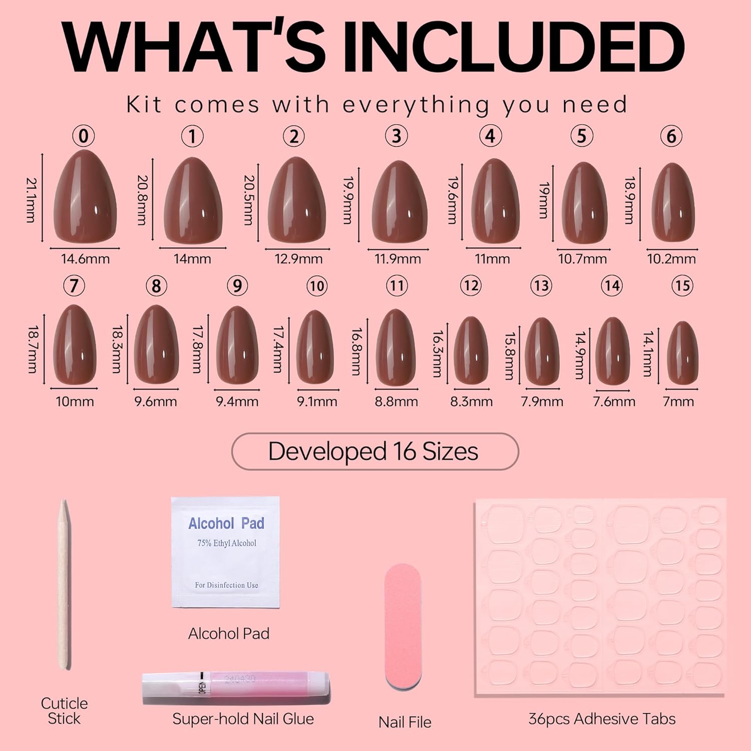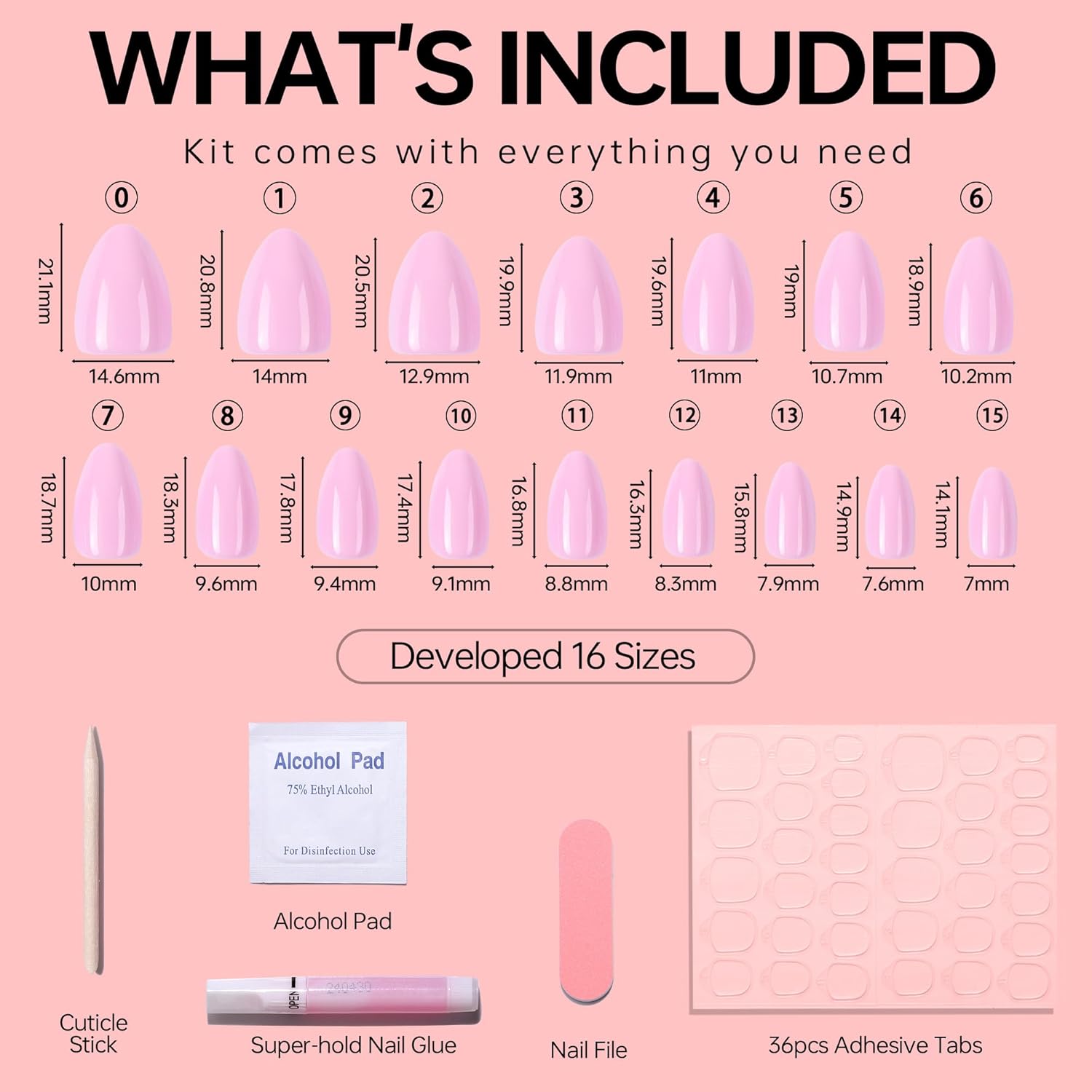 - What is Included: 32pcs press on nails french tip in 16 Sizes,1 nail glue, 1 double-sided nail file, 1 cuticle stick,36pcs jelly stickers and 1 alcohol pad