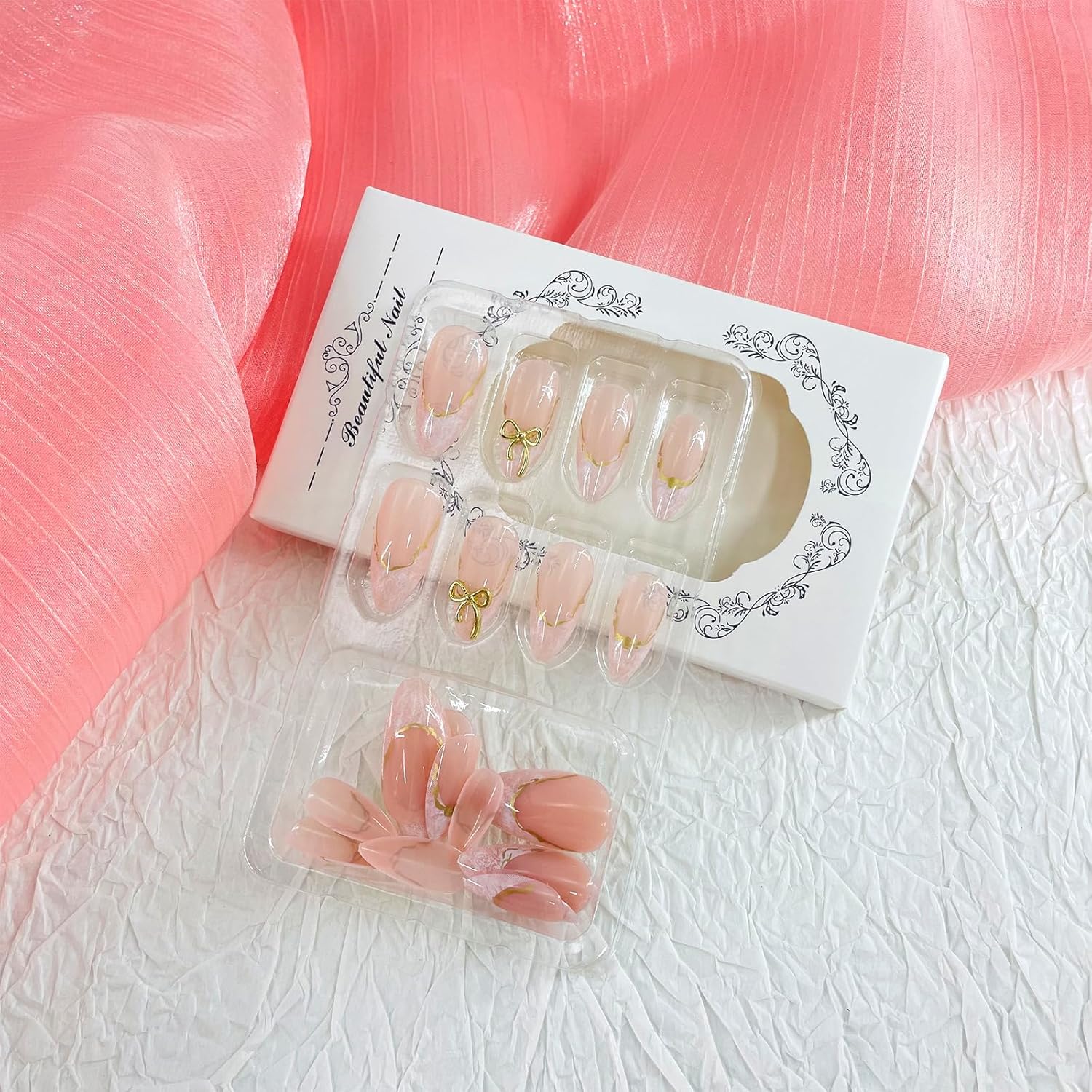 French Tip Almond Press-On Nails with Gold Bow | Reusable Glossy Acrylic False Nails for Women