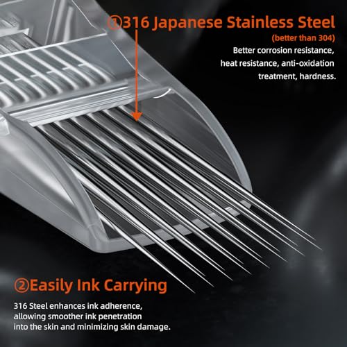 - ??[Japanese 316 Cartridge Needles] ¨çMade of premium Japanese 316 stainless steel (better than 304) with blade-grade craftsmanship, offering higher hardness (preventing dulling of the needle tip), better corrosion resistance and heat resistance, anti-oxidation treatment, maintaining sharp stable needle projection, uniform ink insertion, and reducing skin damage. ¨èTransparent needle tip for clear visibility, oblique cut for distinct needle projection.