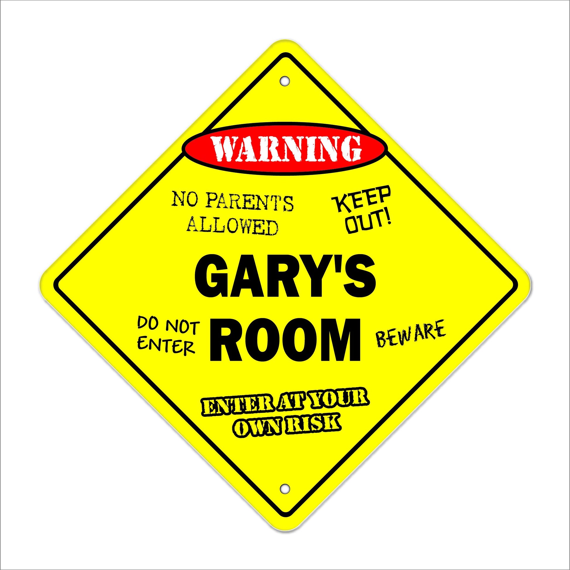 Details: Everybody loves personalized gifts and this is perfect for those kids in your life Made in the USA these signs are sturdy weatherproof plastic 12“ tall and 12“ wide diamond shaped with rounded corners and 2 cut mounting holes. Made To last Made from a special plastic designed to hold up to a beating, This sign can bend with out breaking and will never chip or crack, the colorful lettering will last a lifetime indoors and up to 4 years in the sun for outdoor use. Safe for A Childs Room Our signs have rounded edges and our made of a very strong but lightweight plastic so you can hang it in your child's room without the worry of it falling and hurting your child or cutting them with sharp edges. Product Details: Gary's Room Signore-Cut Mounting Holes Indoor and Outdoor Use Rust and Fade Resistant One-Sided Scratch Resistant treated Ink Dimension: 12 Tall x 12 Wide Made in the Durable Plastic Click &liquor; Add to Cart to get your Gary's Room sign today and enjoy a good laugh each time you pass by!