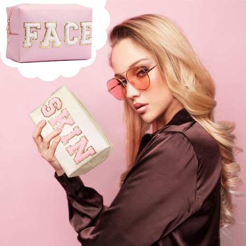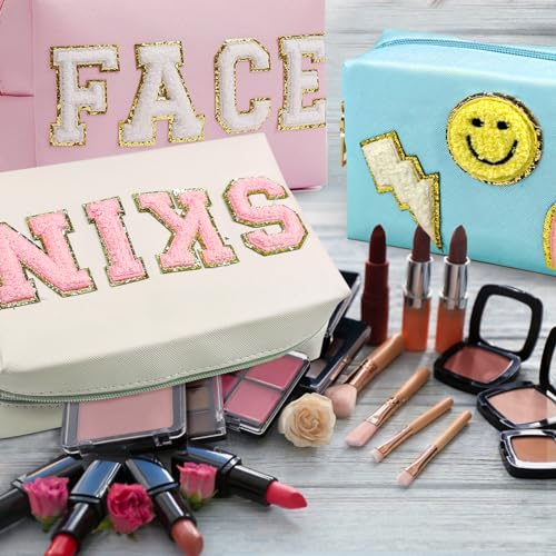 GEMLORD 3 Pieces Preppy Patch Makeup Bag, Small Chenille Letter Cosmetic Bag, PU Leather Waterproof Zipper Skin Care Toiletry Bags for Teen Girls, Portable Preppy Gift for Women(White, Blue, Pink)