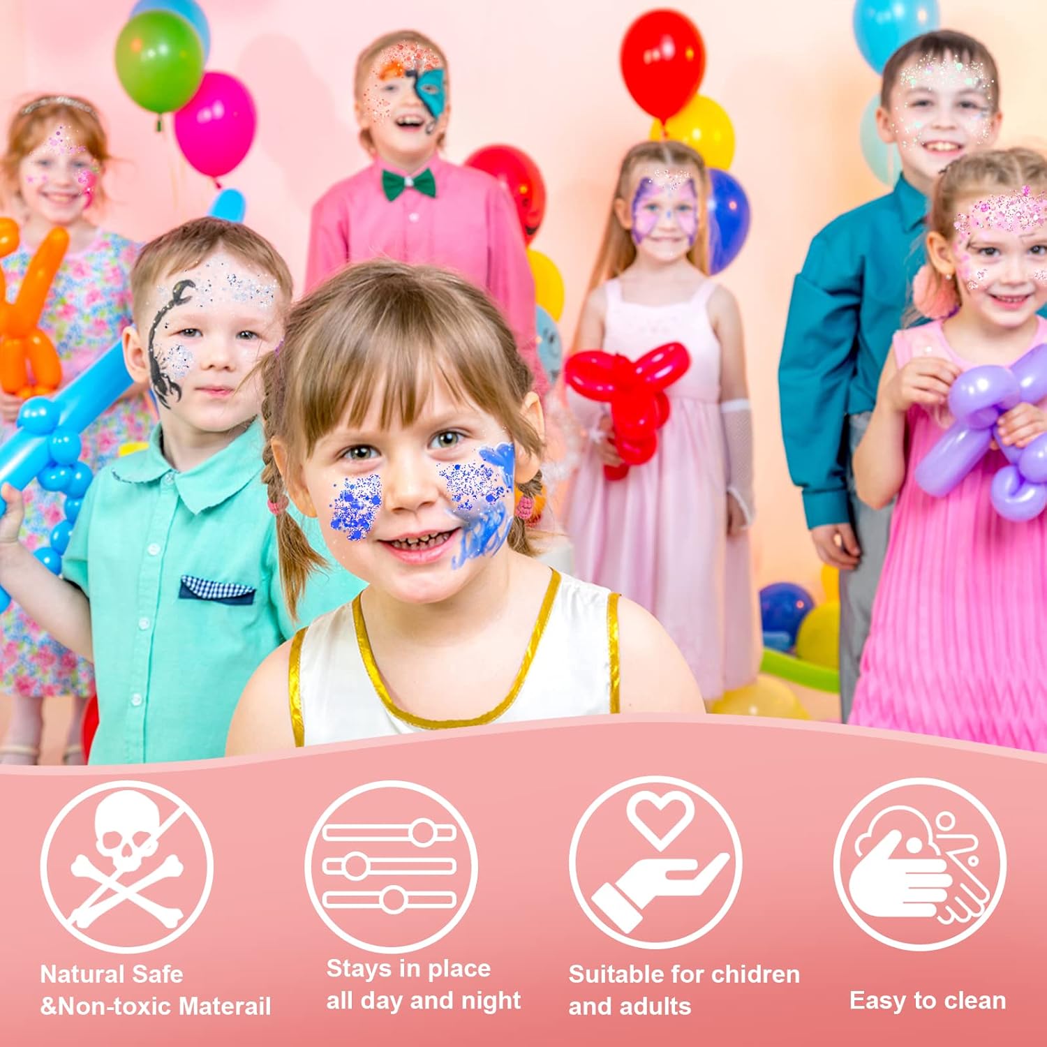 - 【Easy-on,easy-off】Has a stick adhesive,goes on smoothly with a quick swipe of a finger or brush after easy squeezing out.Can be applied over face paint designs or body shimmer without smearing them.For ultimate glitter effect apply in layers letting each layer dry before applying the next.Easily remove with soap and water.