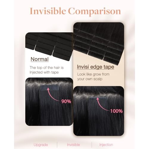 GOO GOO Invisi Edge Tape in Hair Extensions Human Hair, 1B Natural black 10pcs injected with 10pcs classical tape ins, 18inch 50g, Virgin Remy Hair, Natural Look