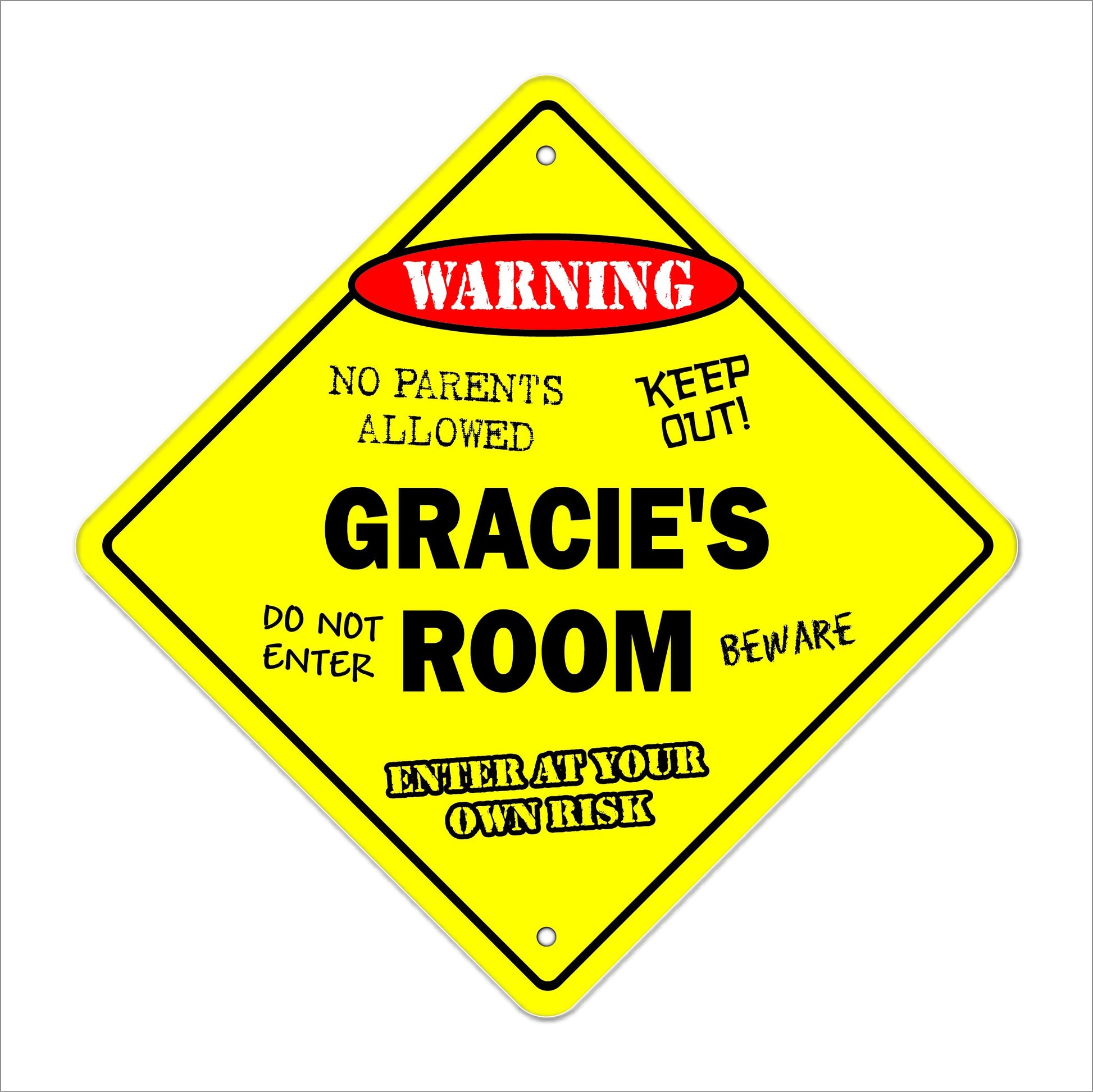 Details: Everybody loves personalized gifts and this is perfect for those kids in your life Made in the USA these signs are sturdy weatherproof plastic 12 tall and 12 wide diamond shaped with rounded corners and 2 cut mounting holes. Made Tolast Made from a special plastic designed to hold up to a beating, This sign can bend with out breaking and will never chip or crack, the colorful lettering will last a lifetime indoors and up to 4 years in the sun for outdoor use. Safe for A Childs Room Our signs have rounded edges and our made of a very strong but lightweight plastic so you can hang it in your child's room without the worry of it falling and hurting your child or cutting them with sharp edges. Product Details: Gracie's Room Sign Pre-Cut Mounting Holes Indoor and Outdoor Use Rust and Fade Resistant One-Sided Scratch Resistant treated Ink Dimension: 12 Tall x 12 Wide Made in the USA Outdoor Durable Plastic Click Add to Cart to get your Gracie's Room sign today and enjoy a good laugh each time you pass by!