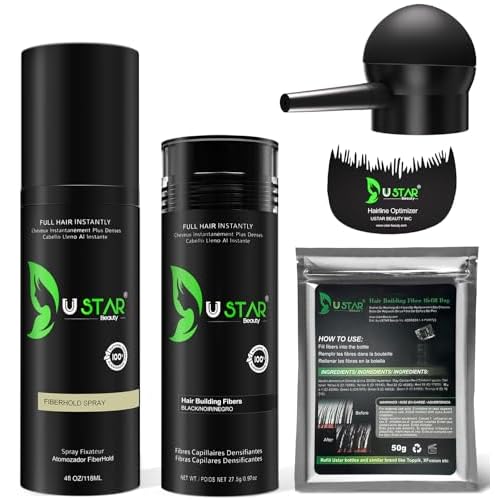 - 5 in 1 Hair Building Fibers Set: USTAR hair fibers set includes everything you need, natural hair fibers, hair spray for fiberhold, spray applicator, comb and hair building fibers refill bag 50g. It comprehensively and perfectly addresses thinning hair issues, instantly adding volume and thickness to create a completely natural-looking full head of hair