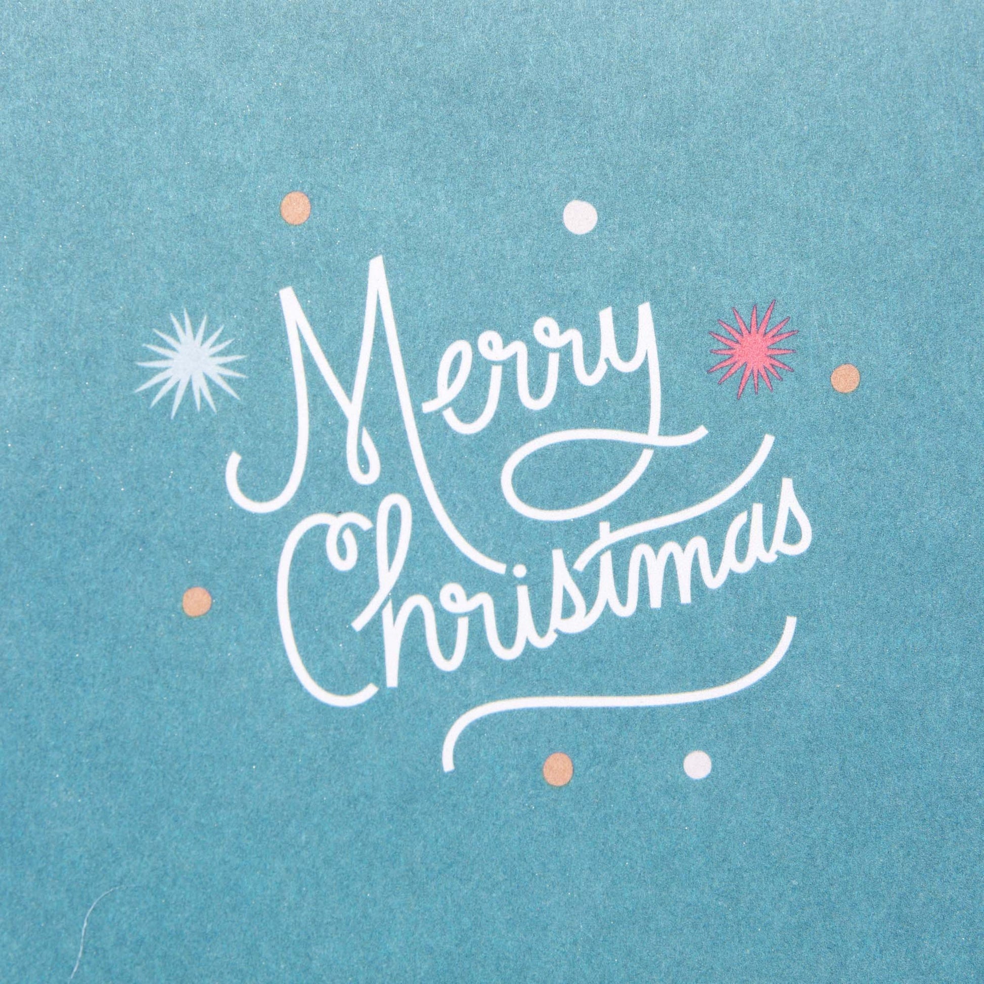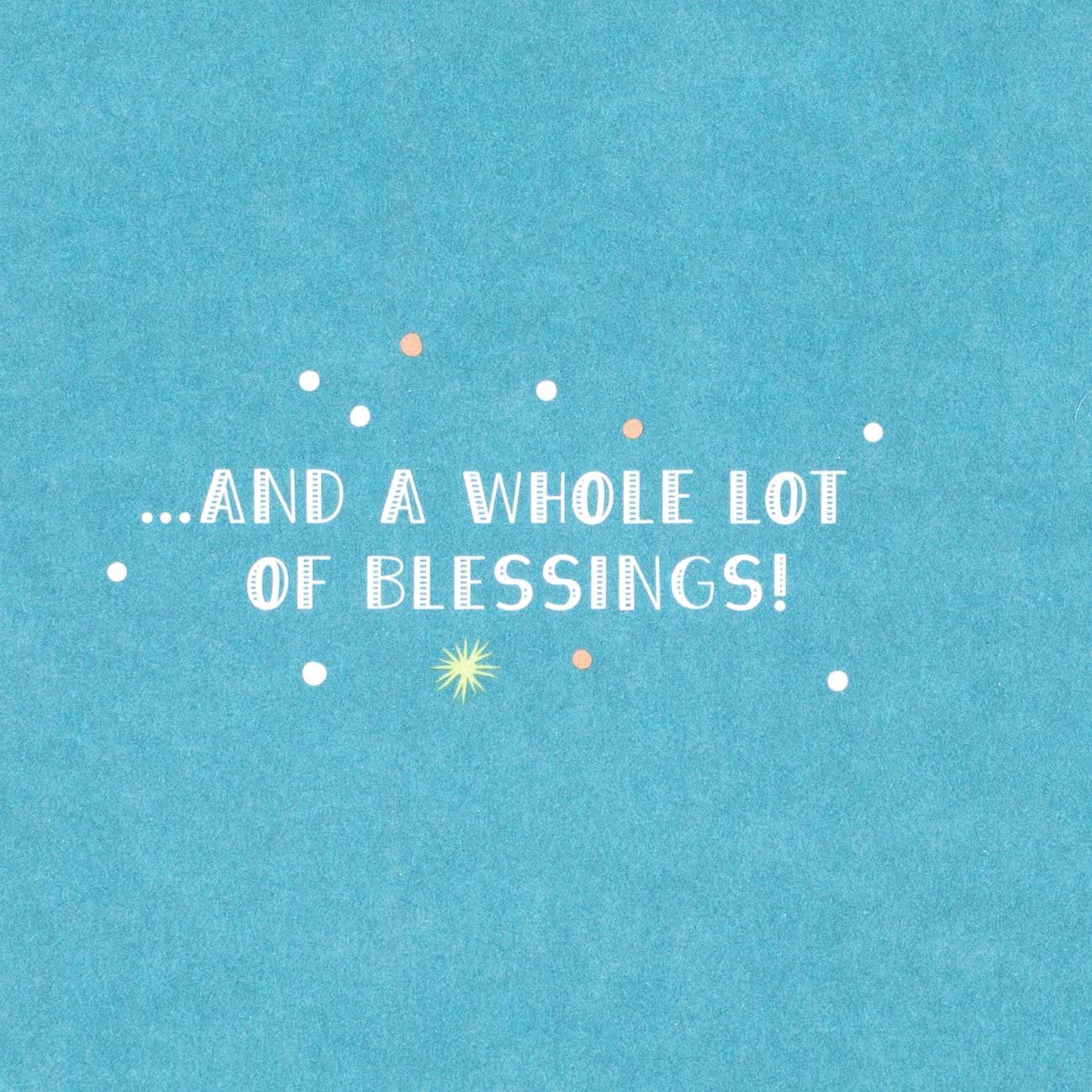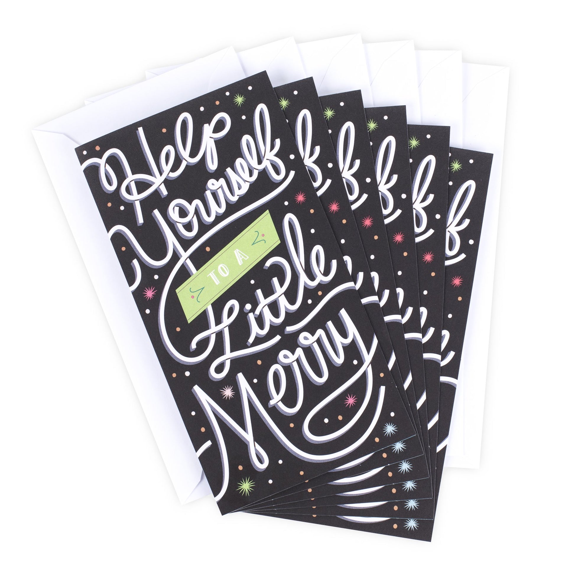 - Holiday card pack includes six cards of a single design with white script lettering on a black background accented with colorful stars and dots. Inside reads: "… and a whole lot of blessings! Merry Christmas.