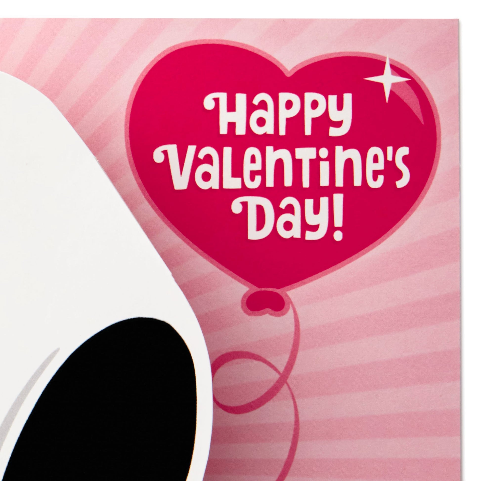 - Funny musical pop-up Valentine's Day greeting card features Snoopy and Woodstock holding heart-shaped balloons paired with a humorous poem. Inside, Snoopy pops out with his arms open wide for a hug as the "Linus and Lucy" song plays. Die-cut details.