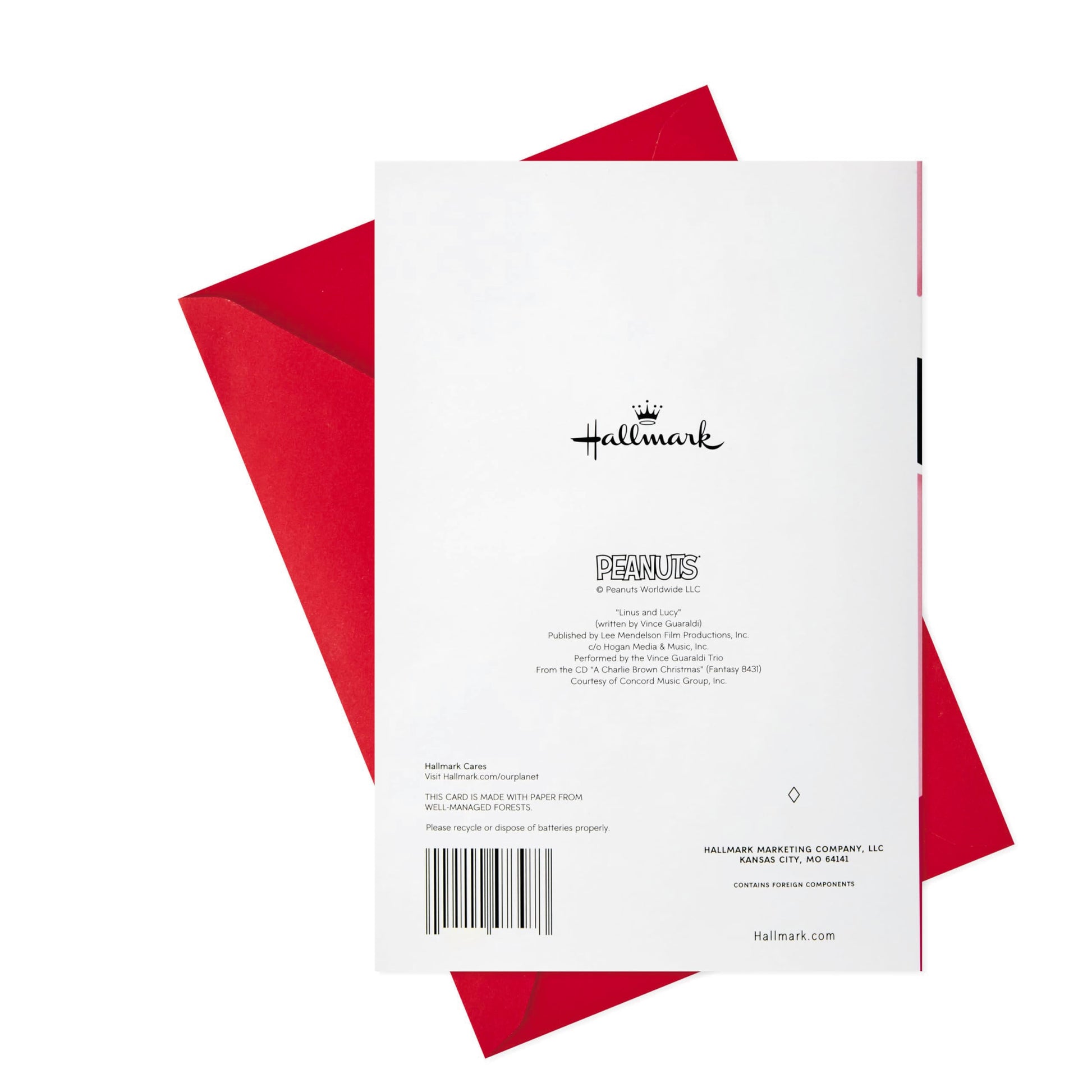 Details: Share a smile with this funny Peanuts valentine. Hallmark musical Valentine's Day card features Woodstock and Snoopy with a fun surprise: Snoopy pops out for a hug as the "Linus and Lucy" song plays. Simply open the pop-up card to reveal the surprise and activate music feature. Musical card plays "Linus and Lucy" performed by the Vince Guaraldi Trio. With a fun pop-up design and a sweet-and-silly sentiment, this cute Peanuts valentine includes plenty of room to write your own message to one of your favorite people. Makes a wonderful accompaniment to any valentine gift, too. Perfect for sharing with your son, daughter, granddaughter, grandson, grandchildren, kids, friends, family or any Peanuts or Snoopy fan on Valentine's Day. For ages 3+. Hallmark features a card for every connection and occasion, providing an authentic way to enhance, nurture and celebrate your relationships.