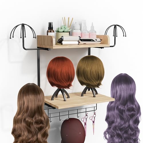 Hanging Wig Organizer with 6 Hooks, Wall Mounted Wig Stand and Wooden Storage Shelf