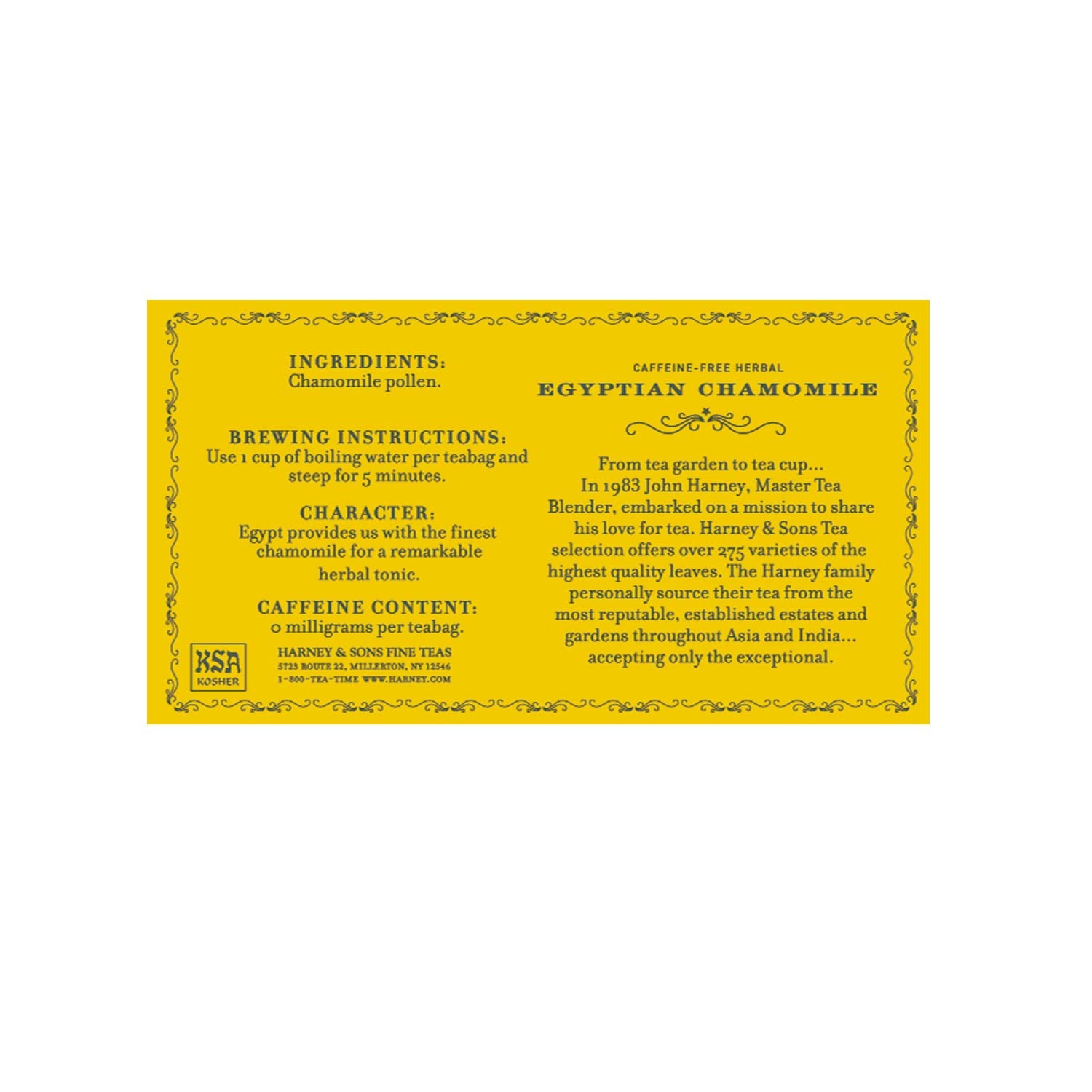 Details: Egypt provides us with the finest chamomile flowers. This produces a tisane with definite body. Perfect for an evening cup at home, or winding down during a hectic day at the office, our large box of 50 convenient tea bags ensures you'll run out less often. Each tea bag brews a 6 to 8 oz cup of tea