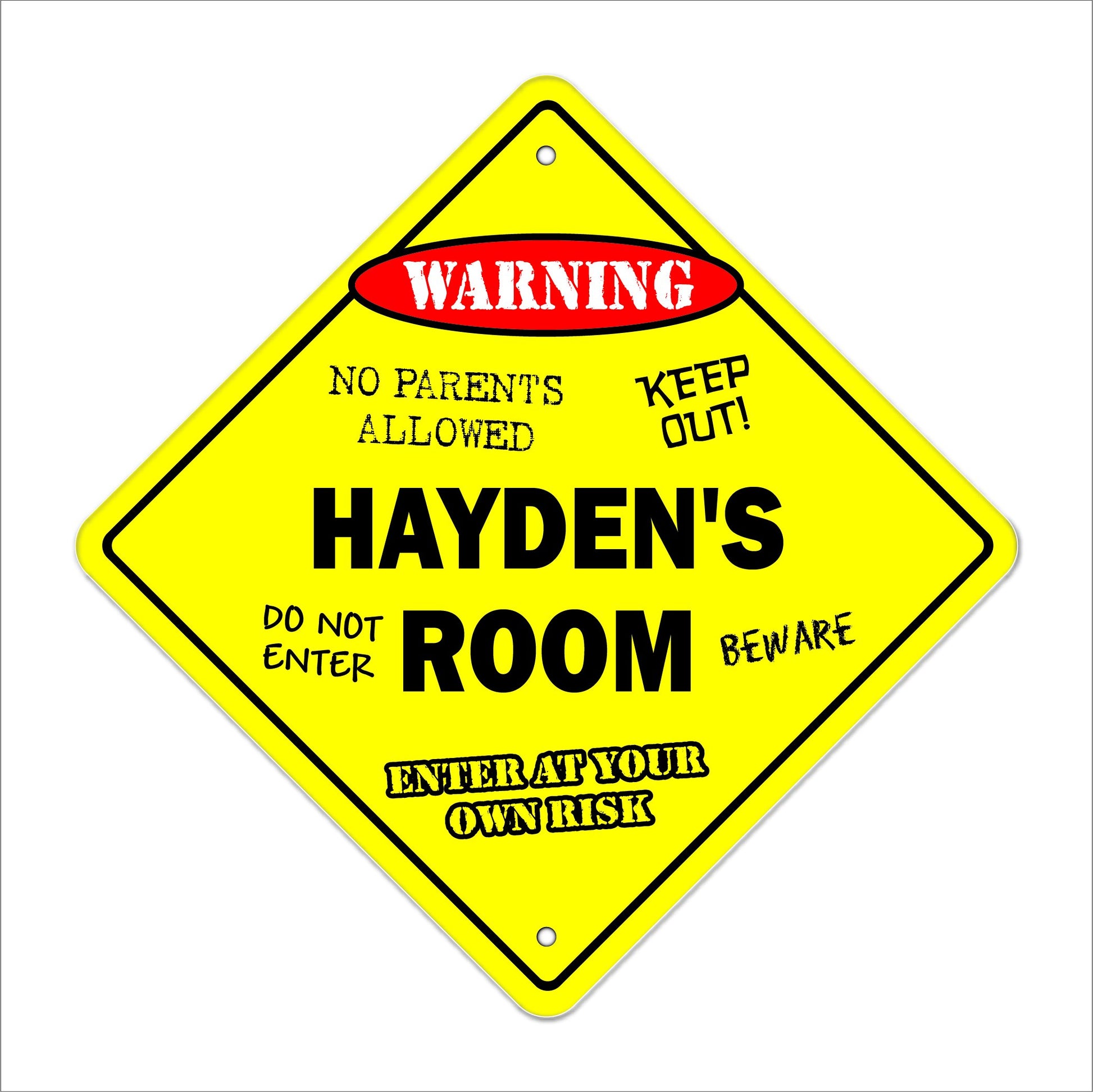 Details: Everybody loves personalized gifts and this is perfect for those kids in your life Made in the USA these signs are sturdy weatherproof plastic 12“ tall and 12“ wide diamond shaped with rounded corners and 2 cut mounting holes. Made ToastMade from a special plastic designed to hold up to a beating, This sign can bend with out breaking and will never chip or crack, the colorful lettering will last a lifetime indoors and up to 4 years in the sun for outdoor use. Safe for A Childs Room Our signs have rounded edges and our made of a very strong but lightweight plastic so you can hang it in your child's room without the worry of it falling and hurting your child or cutting them with sharp edges. Product Details: Hayden's Room SignPre-Cut Mounting Holes Indoor and Outdoor Use Rust and Fade Resistant One-Sided Scratch Resistant treated Ink Dimension: 12 Tall x 12 Wide Made in the Durable Plastic Click ‘ Add to Cart to get your Hayden's Room sign today and enjoy a good laugh each time you pass by!