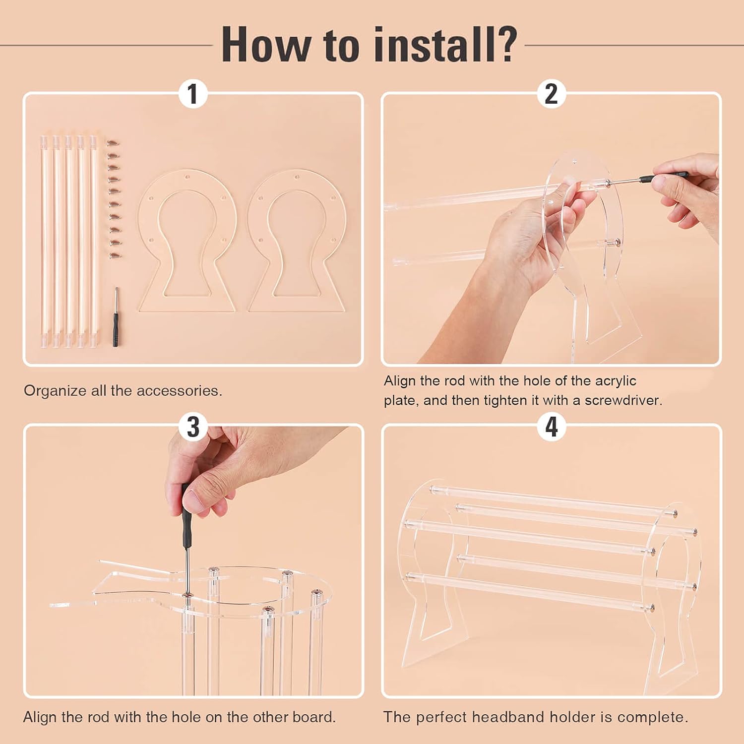 - 【Easy to Assemble】: The installation method of this headband organizer is very simple. Include installation tools and instructions in the package. You can quickly complete the holder in just a few installation steps.