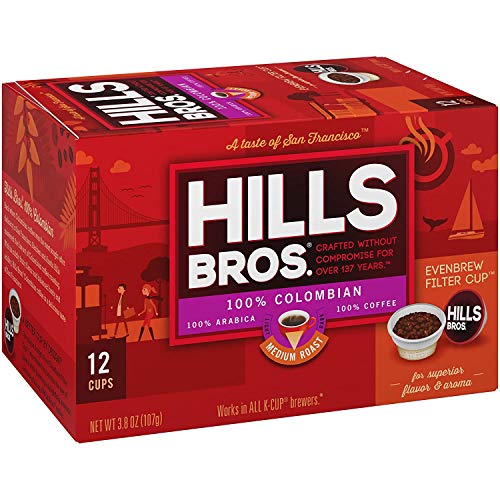 Hills Bros Single Serve Coffee Pods, 100% Colombian Ground Coffee, Medium Roast, 12 Count – Keurig Compatible, Roasted 100% Arabica Beans, Smooth Balanced Flavor