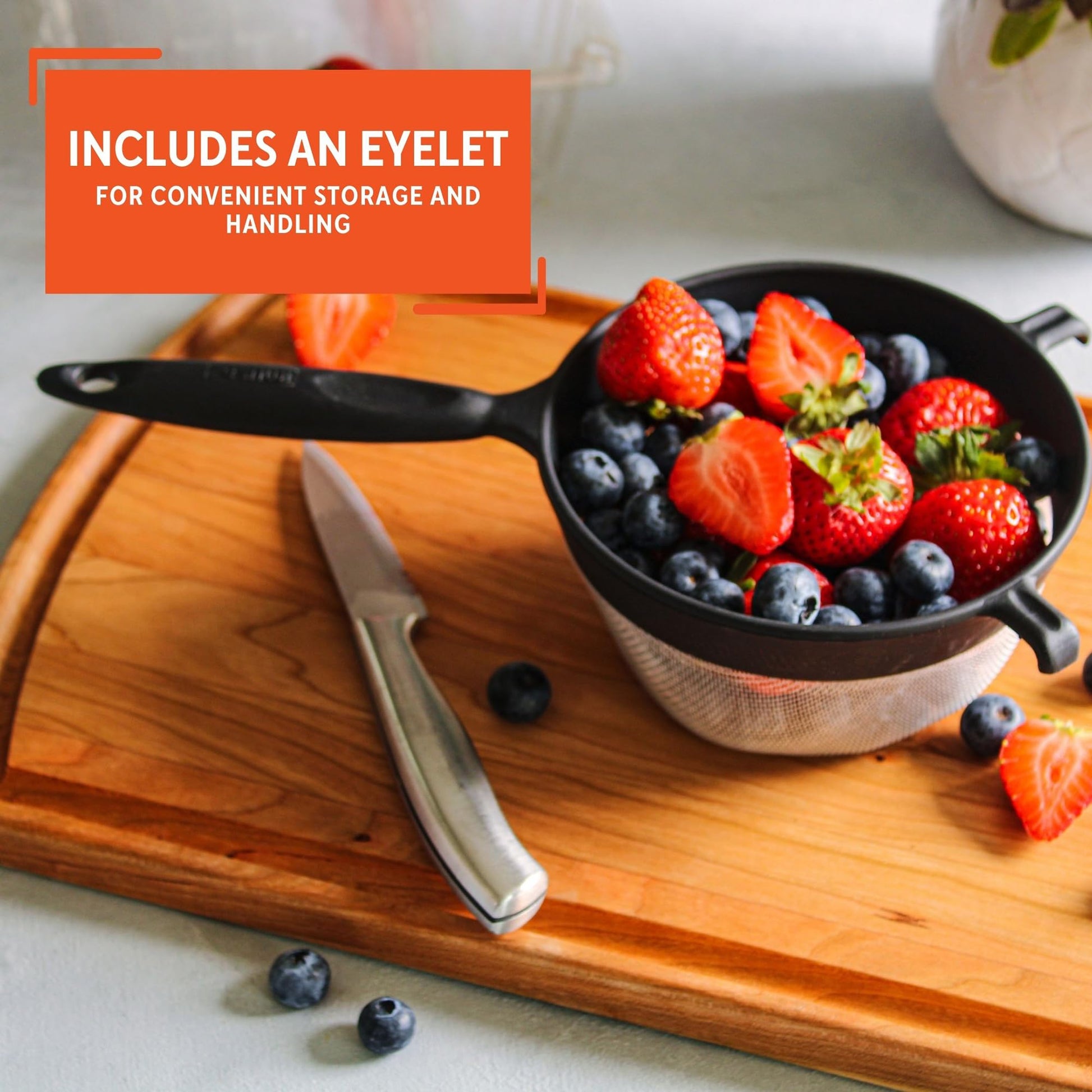 - SECURE FUNCTIONALITY: Features a secure design that sits firmly on pots and bowls, an eyelet for easy storage, and a functional mesh that makes straining juices, soups, and sauces a breeze