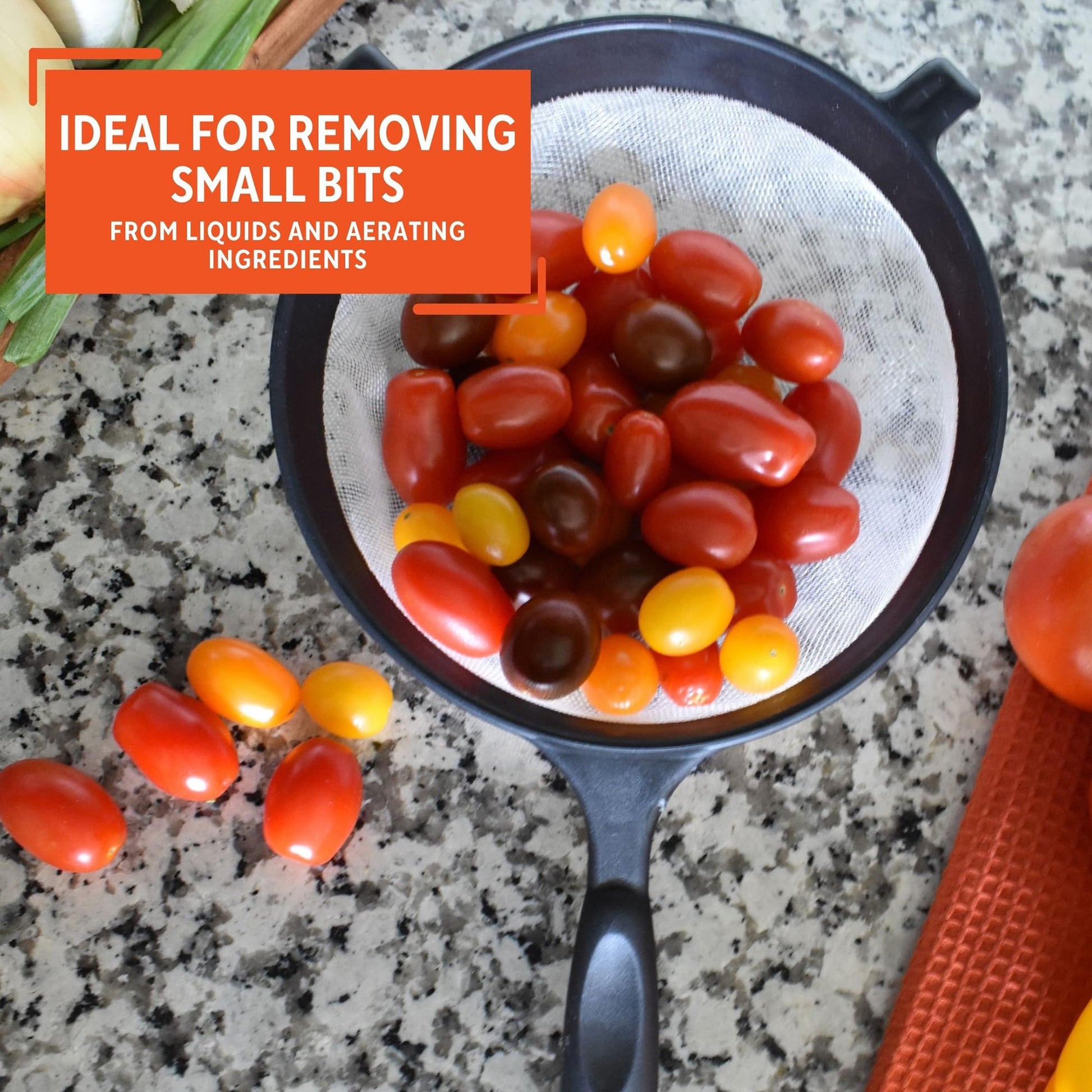 - IDEAL FOR BAKING: Ideal for removing small bits from liquids, aerating ingredients, and eliminating clumps in baked goods, this strainer is a must-have tool for every kitchen