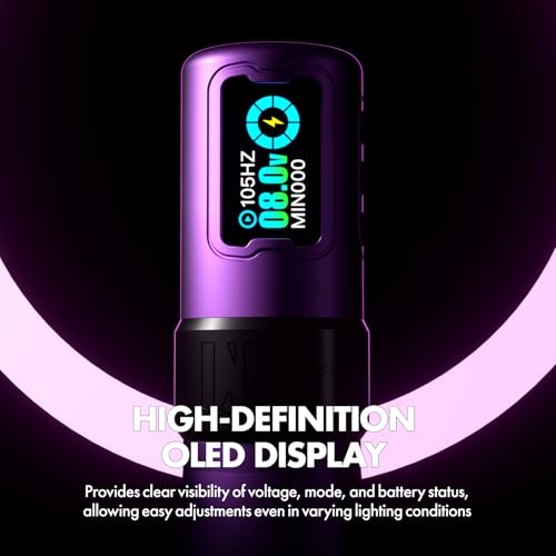 - Rampage Tattoo Machine: Professional tattoo machine is crafted from high-grade aircraft aluminum, which offers lightweight strength and long-lasting performance. The OLED display shows key information with battery life, working voltage. Tattoo machine allows for precise adjustments between 5-12V, ensuring smooth, consistent operation and enhancing the artist's efficiency.