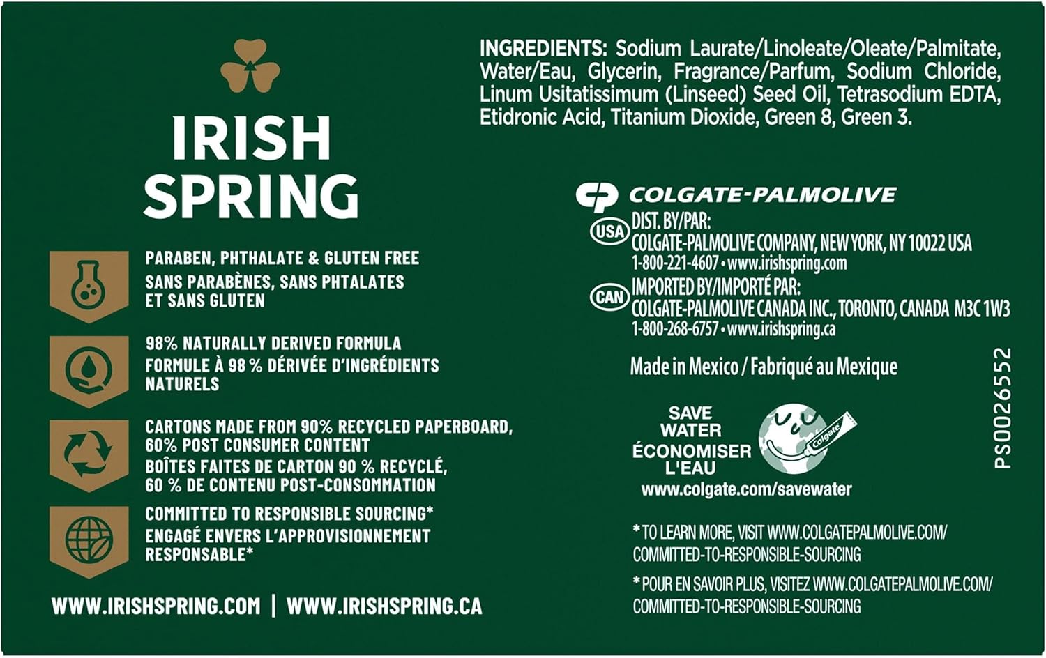 The one that started it all! Get that crisp, classic scent you love with Irish Spring Original Deodorant Bar Soap. Irish Spring Original bar soap delivers the gentle and caring formula you love, with a fresh, clean, and invigorating scent to leave you refreshed. Irish Spring Original Deodorant Bar Soap provides 12-hour deodorant protection, so you can feel fresh throughout the day.