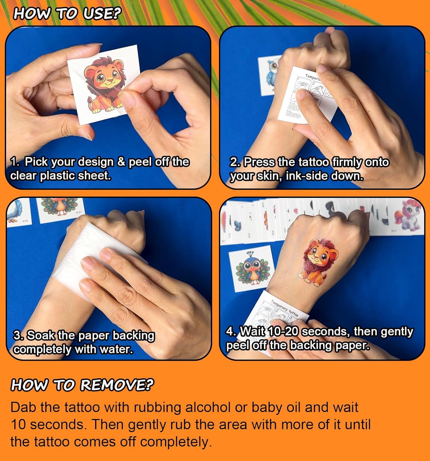 - Temporary Tattoos for Kids | Adults: You will receive 102 kinds of animal-themed party favors for kids, including jungle animals, farm animals, marine animals, etc. Each pattern is carefully designed to be unmatched and has no duplicates. Be the bright presence in the crowd