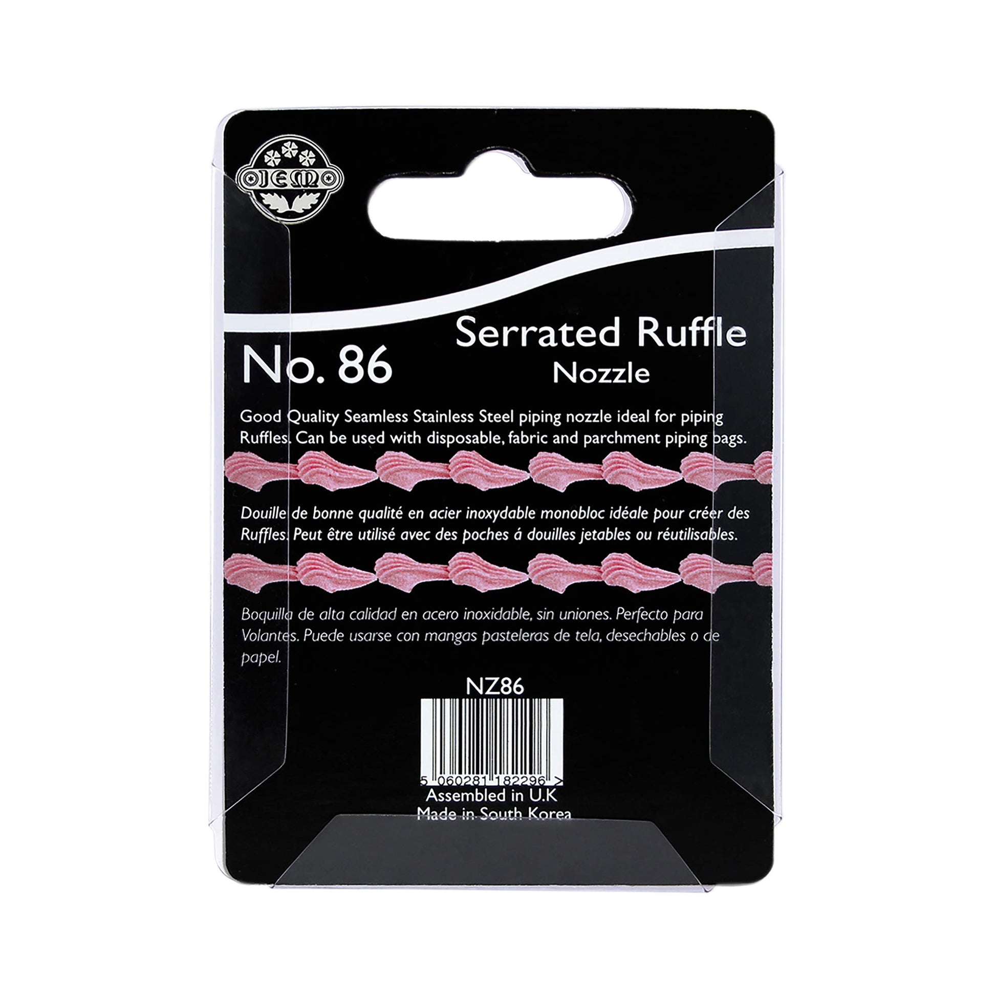 Details: JEM Serrated Ruffle Piping Nozzle no. 86 Ideal for piping serrated ruffle lines Dimensions: tip 1.7 x 10.1 mm base diameter 18 mm height 31 mm All nozzles work with parchment, disposable and fabric piping bags Made from high quality seamless stainless steel