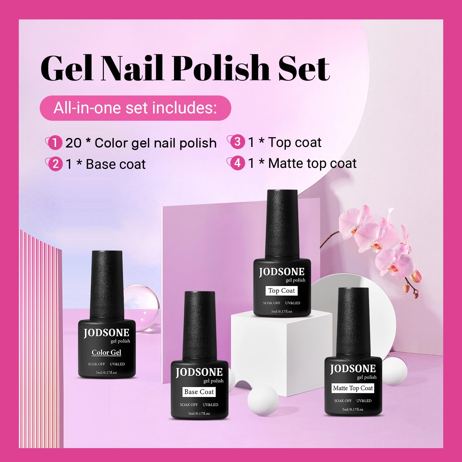 JODSONE Gel Nail Set 20+3 Colors High Shine Gorgeous Gel Polish Base Top Matte Coat Nice Gifts Show Charm