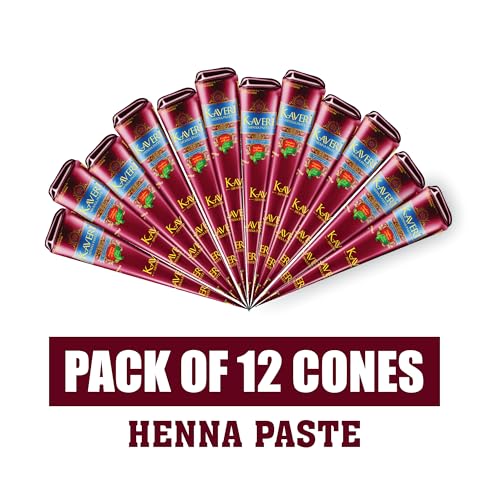 - PREMIUM QUALITY - Kaveri premium henna cones made with, Henna Paste, Nilgiri Oil & Clove oil. These Henna Cones are perfect for all occasions. Get creative and make your own designs OR use stencils to construct the perfect design OR apply on hair roots and have fun! Great for parties, festivals, Halloween costumes, Christmas, Coachella, New Orleans Jazz & Heritage Fest, or anytime you¡¯re feeling creative, Complies with cosmetic regulations.
