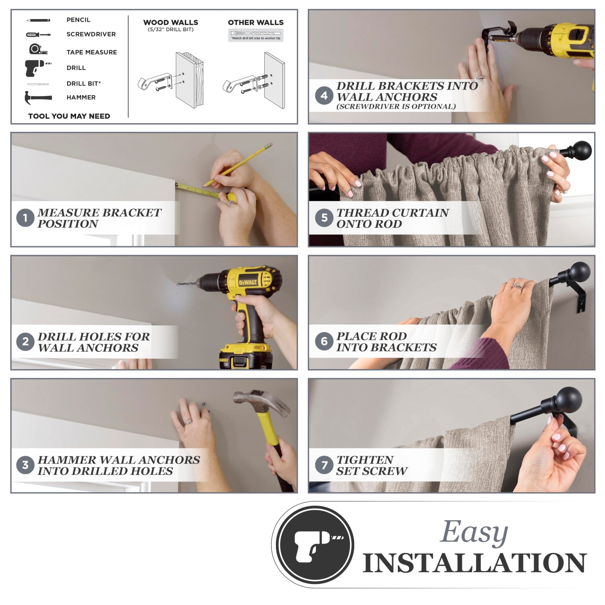Drapery Hardware Set Includes: one telescoping steel curtain rod with decorative ball finials (1.78" L x 1.48" W x 1.48" H), two mounting brackets, screws, drywall anchors, and installation instructions.