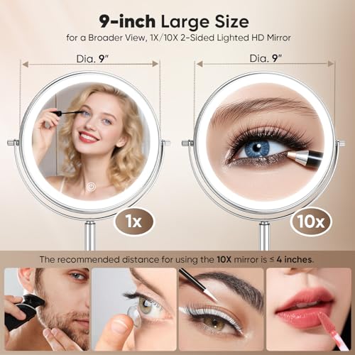 - ??¡¼9" Large Dual-Sided Mirror with 1X/10X True HD Magnification¡½Enjoy a crystal-clear reflection with the 9-inch large double-sided mirror. The 1X side offers a full, distortion-free view for your overall makeup, while the 10X magnification reveals every fine detail for precise applications ? perfect for eyeliner, eyebrows, skincare, or shaving.? Warm Tip: For the clearest view, keep a 4?6 inch distance when using the 10X magnification.