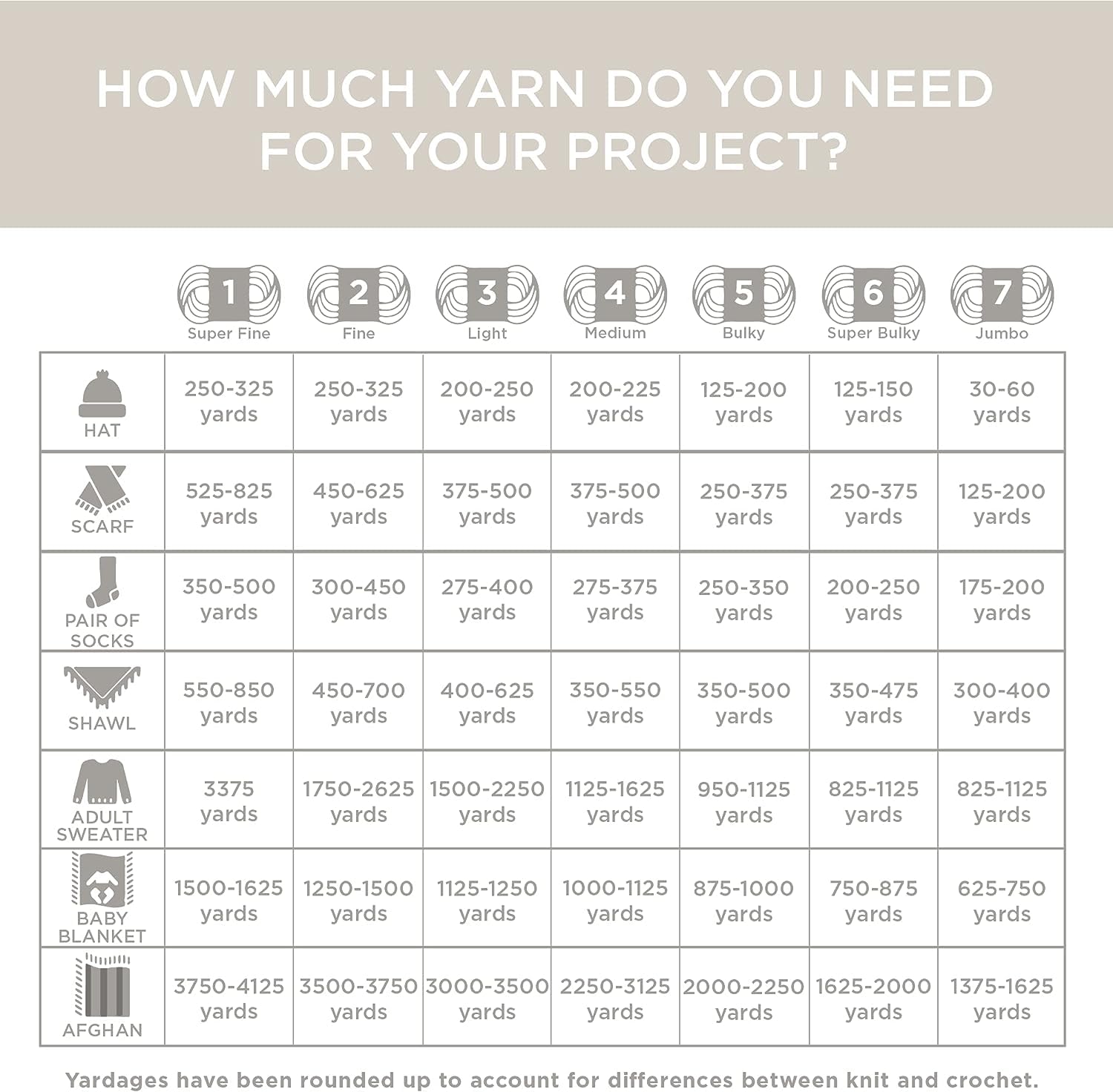 - FIBER COUNT: This yarn for crocheting is made from soft 100% acrylic (solids) or 94% acrylic and 6% rayon (prints). It is rated CYC #4 medium and is a wonderful multiuse yarn for any knit or crochet project.