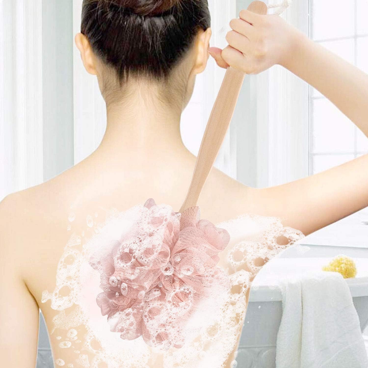 - Perfect Foaming Effect - The loofah sponge with handle has dense and fluffy meshes, which can create rich fine foam with only little body wash. With the body shower loofah scrubber gently massages to leave you with smoother, softer and younger-looking skin.
