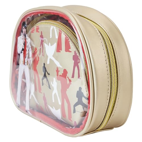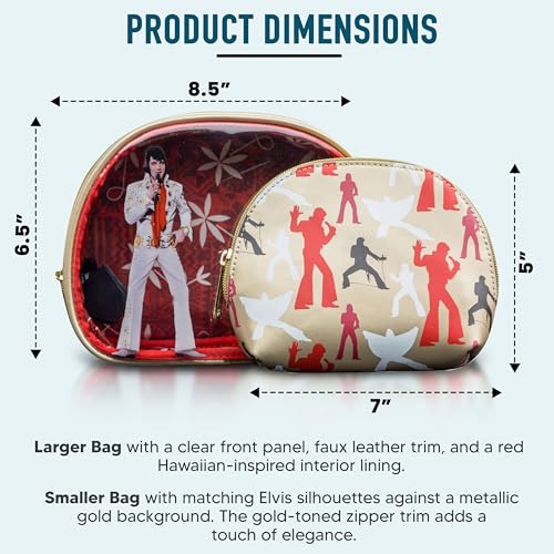 - Smaller Bag: Measures about 7" x 5" x 2", with matching Elvis silhouettes against a metallic gold background. The gold-toned zipper trim adds a touch of elegance.