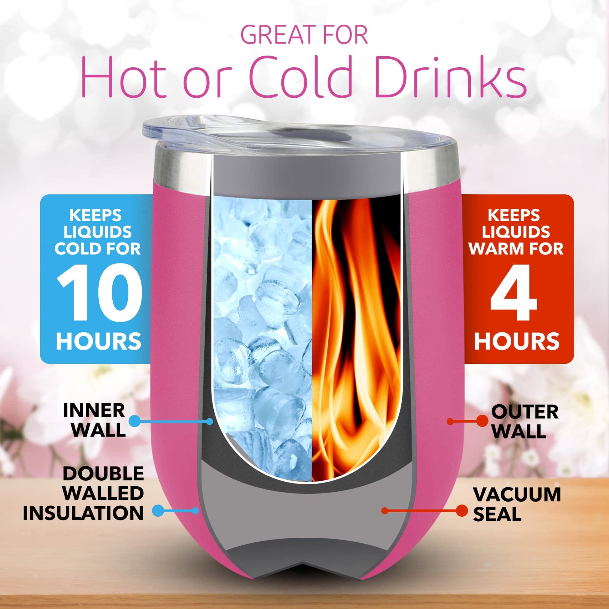 - NOT JUST FOR WINE: Suitable for hot and cold drinks, the beverage tumblers can be used for drinking coffee, tea, or cocktails. The double vacuum seal insulation means longer-lasting temperature control. Use the tumbler as travel wine tumblers, coffee cup and thermal beverage tumbler.