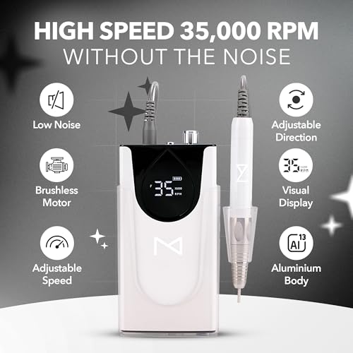 M Max - Nail Drill Professional - 2-in-1 Brushless Motor Nails Drill Machine - Electric, Cordless, Aluminium Alloy Casing, 35000 RPM, HD Display - Perfect for Salon & Home Use (White)
