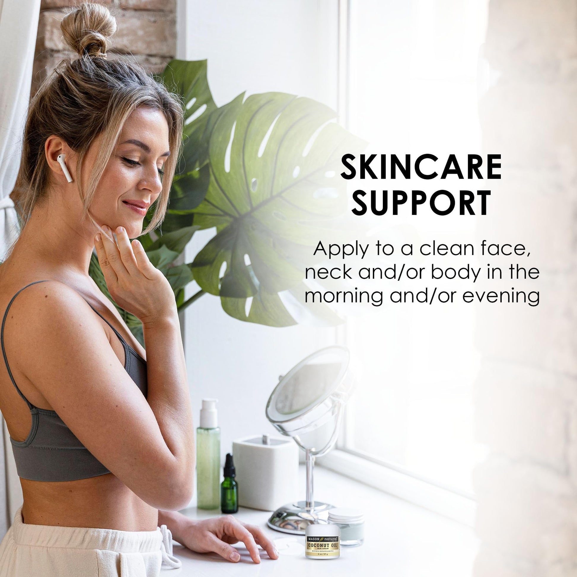 - COCONUT OIL BENEFITS: May provide temporary support for dry skin while supporting the skin’s natural healing process & promoting a smoother, more youthful appearance