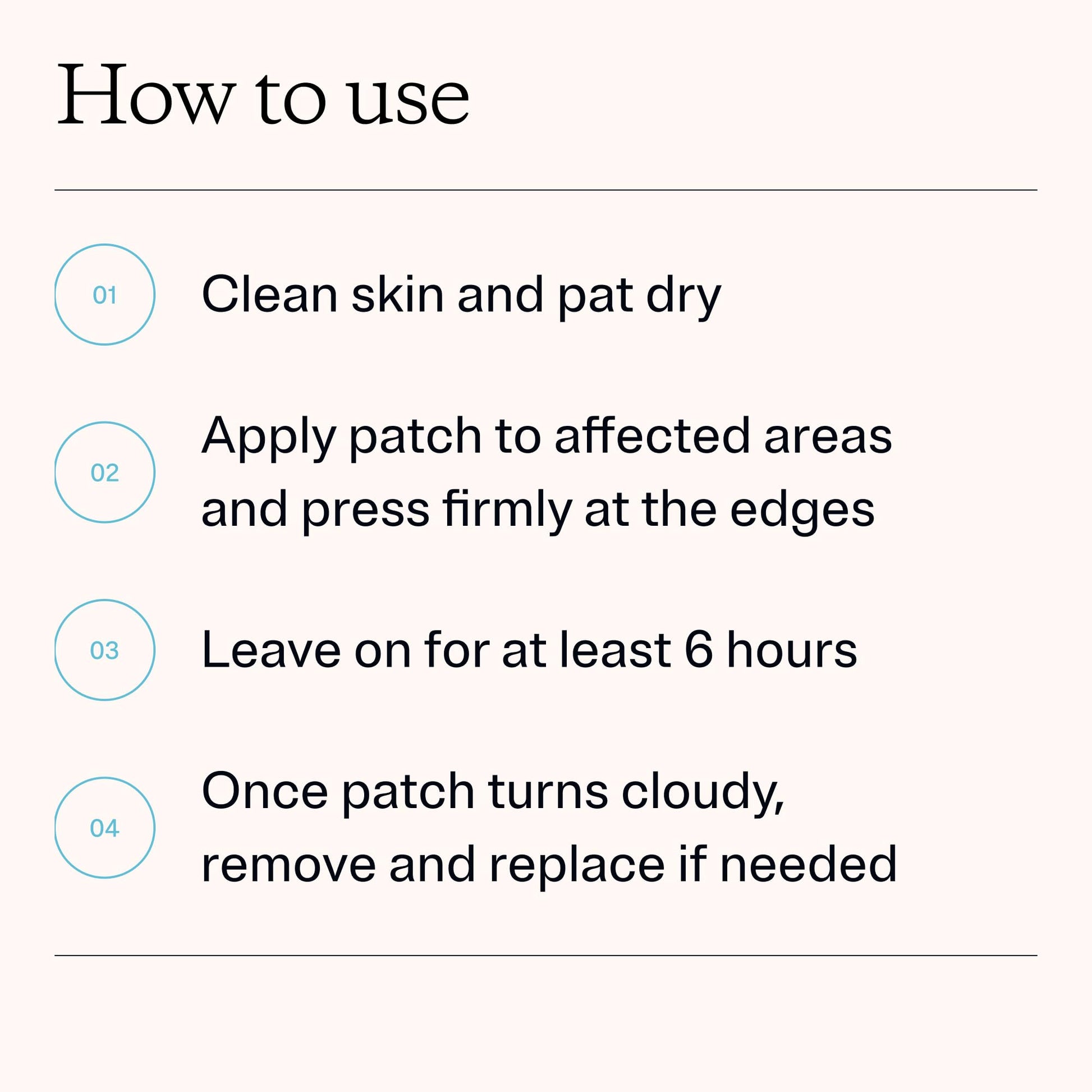 - HOW TO USE: Clean your skin and pat dry. Apply the patch to the affected area and press firmly at the edges. Leave the patch on the skin for at least 6 hours. Once the patch turns cloudy, peel to remove and replace with a new one if needed.
