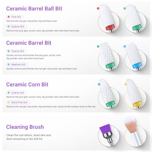 - ALL-IN-ONE SET: The nail drill bit set includes 6pcs ceramic nail file bits, 8pcs diamond carbide drill bits, 5pcs basic nail drill Bits, 1pcs cleaning brush, and 1pcs long cleaning brush, suited for both beginners and professionals.