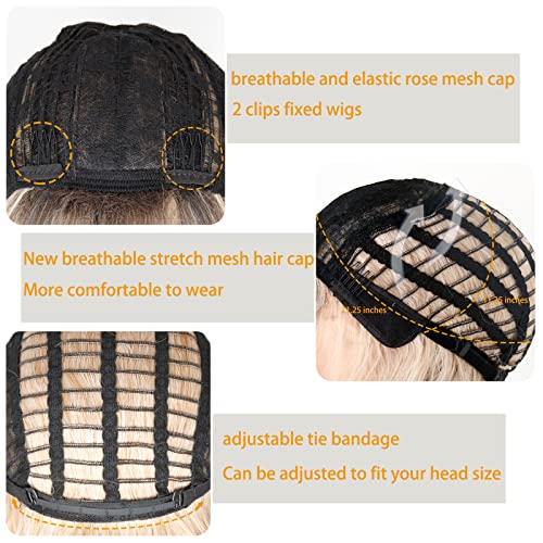 MISSQUEEN Ombre Short Blonde Wigs with Bangs Synthetic Wavy Blond Bob Wig Curly Heat Resistant Blonde Hair Wig for Women Daily Party Halloween Use