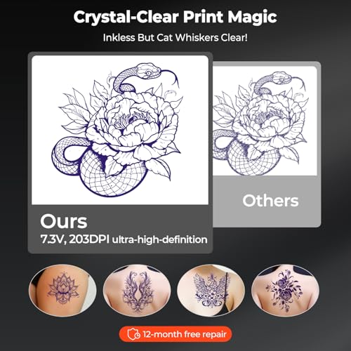 - High-Quality Inkless Printing: 7.3V, 203DPI ultra-high-definition thermal semiconductor printhead ensures exceptional printing quality. The line processing algorithm has been optimized to ensure precise and accurate line art prints. Utilizing thermal printing technology, this printer eliminates the need for ink cartridges entirely. For large color block designs, you can enhance your results using the App's line conversion mode