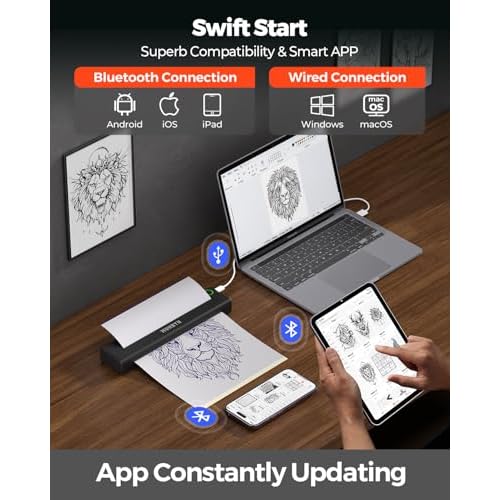 - Compatibility: MUNBYN ITP05 tattoo printer is compatible with Android and iOS mobile devices (phone & tablet), allowing you to connect via Bluetooth for seamless printing. For PC devices, it supports Windows and macOS, requiring a wired connection. Notice: For PC devices, this printer does not support Bluetooth connectivity