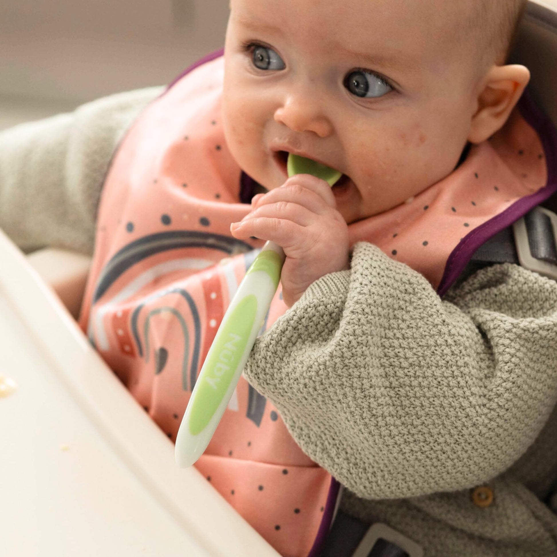Details: Nuby's Feeding Spoons are uniquely designed with Easy Grip comfort handles to help make feeding easier for both parents and baby. Extended handles also make it easier for reaching in to the bottom of pots and jars. Each great value pack includes 6 colorful spoons.