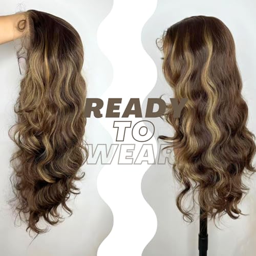 Ombre Brown Highlight Lace Front Wigs 13X6 Body Wave Synthetic Lace Front Wig For Black Women Highlight Wavy Wigs HD Glueless Lace Frontal Wigs Free Part Ready To Wear Wig