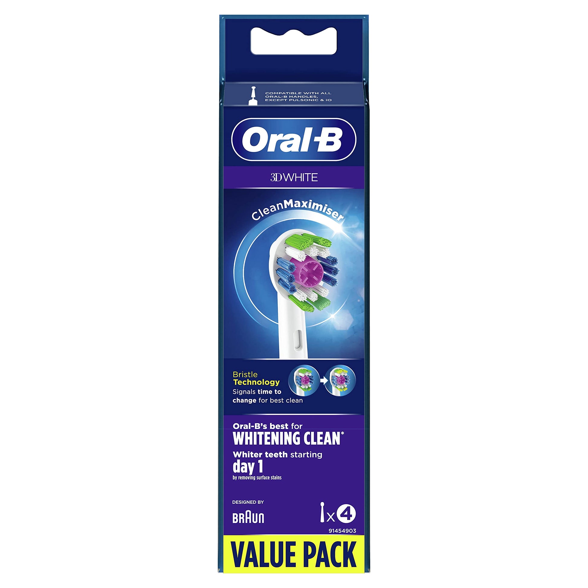 Details: Among the best Oral-B replacement heads, the 3D White model with the unique polishing cup whitens teeth from day one by removing surface stains. Oral-B 3D White improved replacement heads are developed with CleanMaximiser technology, which transforms bristles from green to yellow for optimal performance and better cleaning. Unique bristles brush off the plaque to get more advanced cleaning than a traditional manual toothbrush. Compatible with all Oral-B toothbrushes except Pulsonic and iO.